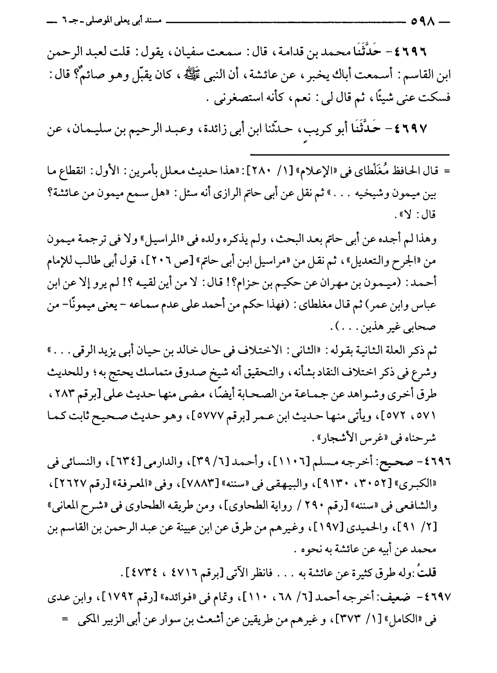 وهذا لم أجده عن أبى حاتم بعد البحث، ولم يذكره ولده في "المراسيل" ولا في ترجمة ميمون من "الجرح والتعديل"، ثم نقل من "مراسيل ابن أبى حاتم" [ص ٢٠٦]، قول أبى طالب للإمام أحمد: (ميمون بن مهران عن حكيم بن حزام؟! قال: لا من أين لقيه؟! لم يرو إلا عن ابن عباس وابن عمر) ثم قال مغلطاى: (فهذا حكم من أحمد على عدم سماعه - يعنى ميمونًا - من صحابى غير هذين ... ).