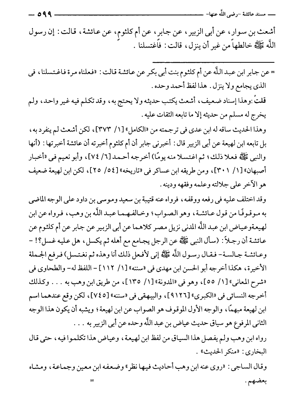 وقد اختلف عليه في رفعه ووقفه، فرواه عنه قتيبة بن سعيد وموسى بن داود على الوجه الماضى به موقوفًا من قول عائشة، وهو الصواب؛ وخالفهما عبد الله بن وهب، فرواه عن ابن لهيعة وعياض بن عبد الله المدنى نزيل مصر كلاهما عن أبى الزبير عن جابر عن أم كلثوم عن عائشة أن رجلًا: (سأل النبي - صلى الله عليه وسلم - عن الرجل يجامع مع أهله ثم يكسل، هل عليه غسل؟! - وعائشة جالسة - فقال رسول الله - صلى الله عليه وسلم - إنى لأفعل ذلك أنا وهذه ثم نغتسل) فرفع الجملة الأخيرة، هكذا أخرجه أبو الحسن بن مهدى في "سننه" [١/ ١١٢]- اللفظ له - والطحاوى في "شرح المعانى" [١/ ٥٥]، وهو في "المدونة" [١/ ١٣٥]، من طريق ابن وهب به ... وكذلك أخرجه النسائي في "الكبرى" [٩١٢]، والبيهقى في "سننه" [٧٤٥]، لكن وقع عندهما اسم ابن لهيعة مبهمًا، والوجه الأول الموقوف هو الصواب عن ابن لهيعة؛ ويشبه أن يكون هذا الوجه الثاني المرفوع هو سياق حديث عياض بن عبد الله وحده عن أبى الزبير به ...
