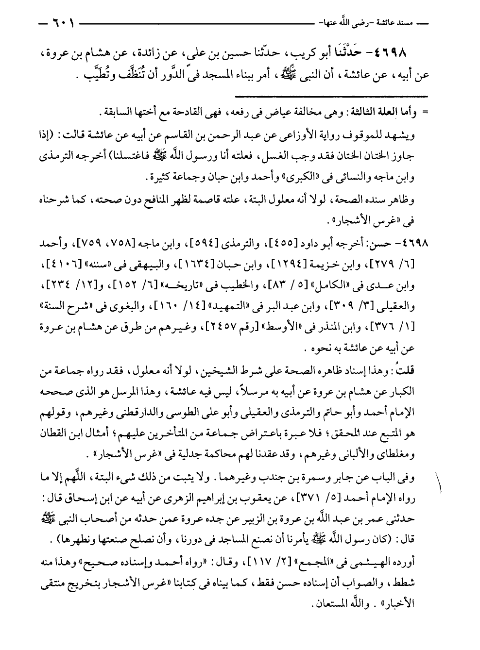 قلتُ: وهذا إسناد ظاهره الصحة على شرط الشيخين، لولا أنه معلول، فقد رواه جماعة من الكبار عن هشام بن عروة عن أبيه به مرسلًا، ليس فيه عائشة، وهذا المرسل هو الذي صححه الإمام أحمد وأبو حاتم والترمذى والعقيلى وأبو على الطوسى والدارقطنى وغيرهم، وقولهم هو المتبع عند المحقق فلا عبرة باعتراض جماعة من المتأخرين عليهم؛ أمثال ابن القطان ومغلطاى والألبانى وغيرهم، وقد عقدنا لهم محاكمة جدلية في "غرس الأشجار".