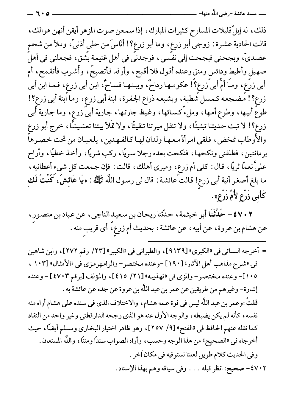 ٤٧٠٢ - حَدَّثَنَا أبو خيثمة، حدّثنا ريحان بن سعيدٍ الناجى، عن عباد بن منصورٍ، عن هشام بن عروة، عن أبيه، عن عائشة، بحديث أم زرعٍ، أي قريبٍ منه.