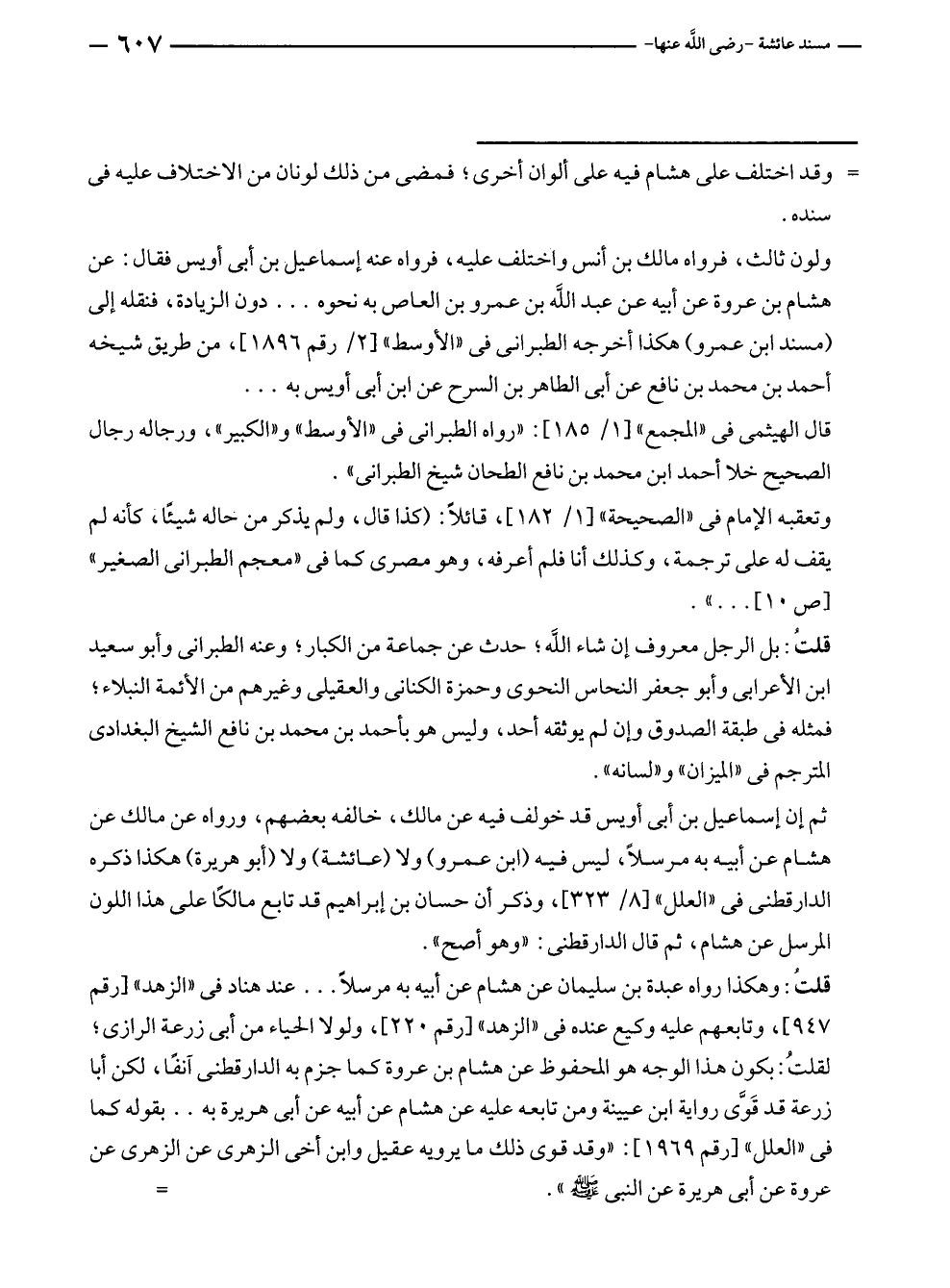 ثم إن إسماعيل بن أبى أويس قد خولف فيه عن مالك، خالفه بعضهم، ورواه عن مالك عن هشام عن أبيه به مرسلًا، ليس فيه (ابن عمرو) ولا (عائشة) ولا (أبو هريرة) هكذا ذكره الدارقطنى في "العلل" [٨/ ٣٢٣]، وذكر أن حسان بن إبراهيم قد تابع مالكًا على هذا اللون المرسل عن هشام، ثم قال الدارقطنى: "وهو أصح".