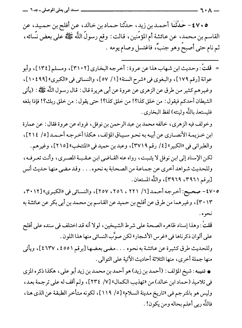 ٤٧٠٥ - حَدَّثَنَا أحمد بن زيد، حدّثنا حماد بن خالد، عن أفلح بن حميد، عن القاسم بن محمدٍ، عن عائشة أم المؤمنين، قالت: وقع رسول الله - صلى الله عليه وسلم - على بعض نسائه، ثم نام حتى أصبح وهو جنبٌ، فاغتسل وصام يومه.