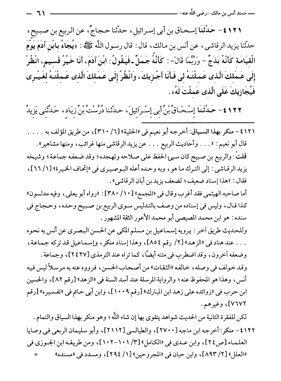 ٤١٢١ - حَدَّثَنَا إسحاق بن أبي إسرائيل، حدّثنا حجاجٌ، عن الربيع بن صبيحٍ، حدّثنا يزيد الرقاشي، عن أنس بن مالكٍ، قال: قال رسول الله - صلى الله عليه وسلم -: "يُجَاءُ بِابْنِ آدَمَ يَوْمَ الْقِيَامَةِ كَأَنَّهُ بَذَجٌ - وَرُبَّمَا قَالَ -: كَأَنَّهُ جَمَلٌ - فَيَقُولُ: ابْنَ آدَمَ، أَنَا خَيْرُ قَسِيمٍ، انْظُرْ إِلَى عَمَلِكَ الَّذِي عَمِلْتَهُ لِي فَأَنَا أَجْزِيكَ، وَانْظُرْ إِلَى عَمَلِكَ الَّذِي عَمِلْتَهُ لِغَيْرِى فَيُجَازِيكَ عَلَى الَّذِي عَمِلْتَ لَهُ".