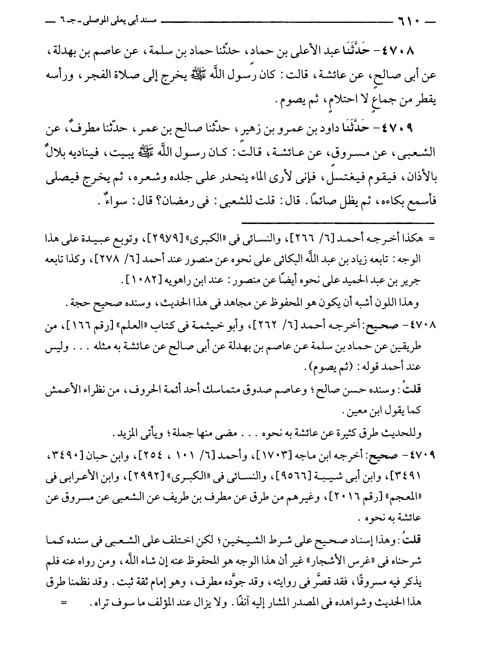 ٤٧٠٨ - صحيح: أخرجه أحمد [٦/ ٢٦٢]، وأبو خيثمة في كتاب "العلم" [رقم ١٦٦]، من طريقين عن حماد بن سلمة عن عاصم بن بهدلة عن أبى صالح عن عائشة به مثله ... وليس عند أحمد قوله: (ثم يصوم).