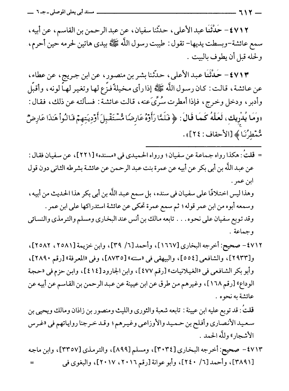 ٤٧١٢ - صحيح: أخرجه البخارى [١٦٦٧]، وأحمد [٦/ ٣٩]، وابن خزيمة [٢٥٨١، ٢٥٨٢]، و [٢٩٣٣]، والشافعى [٥٥٤]، والبيهقى في "سننه" [٨٧٣٥]، وفى "المعرفة" [رقم ٢٨٩٠]، وأبو بكر الشافعي في "الغيلانيات" [رقم ٤٧٧]، وابن الجارود [٤١٤]، وابن حزم في "حجة الوداع" [رقم ١٦٨]، وغيرهم من طرق عن ابن عيينة عن عبد الرحمن بن القاسم عن أبيه عن عائشة به نحوه.