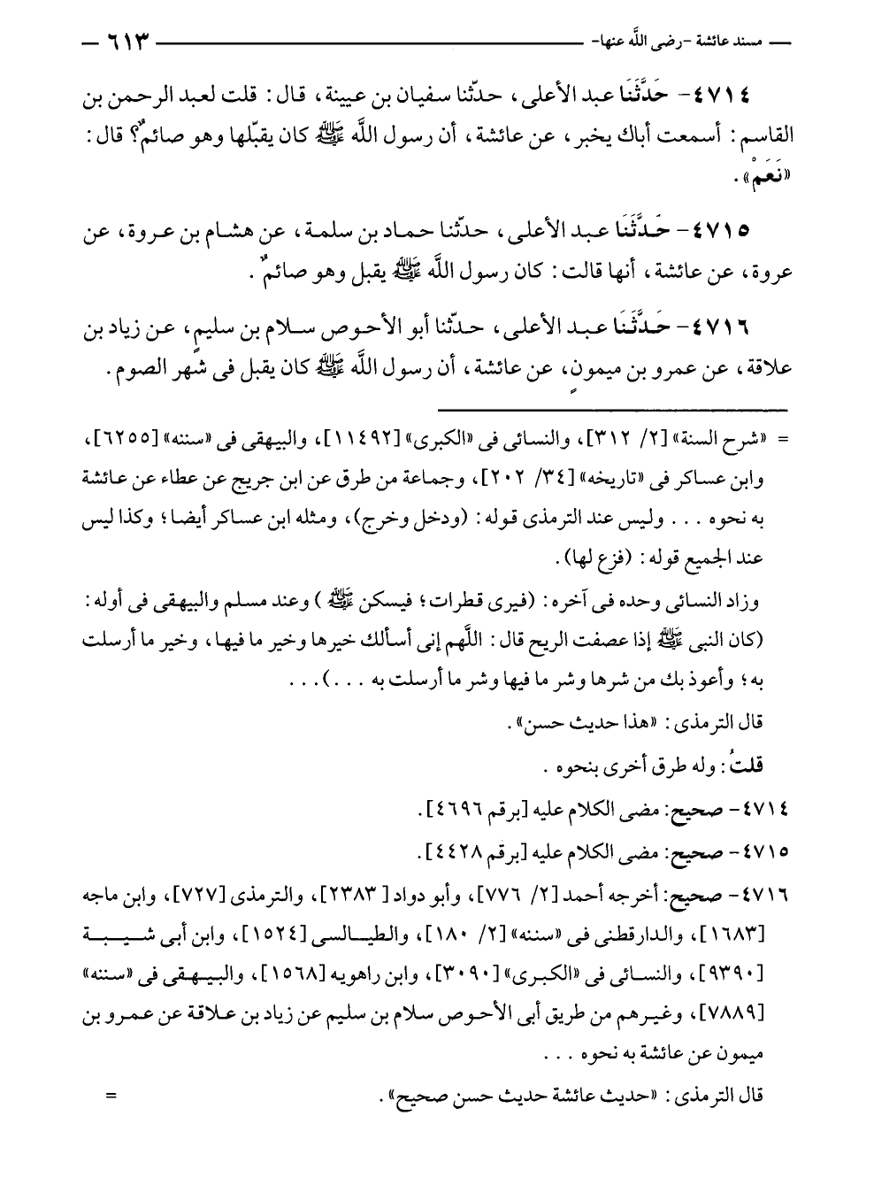 ٤٧١٥ - حدَّثَنَا عبد الأعلى، حدّثنا حماد بن سلمة، عن هشام بن عروة، عن عروة، عن عائشة، أنها قالت: كان رسول الله - صلى الله عليه وسلم - يقبل وهو صائمٌ.
