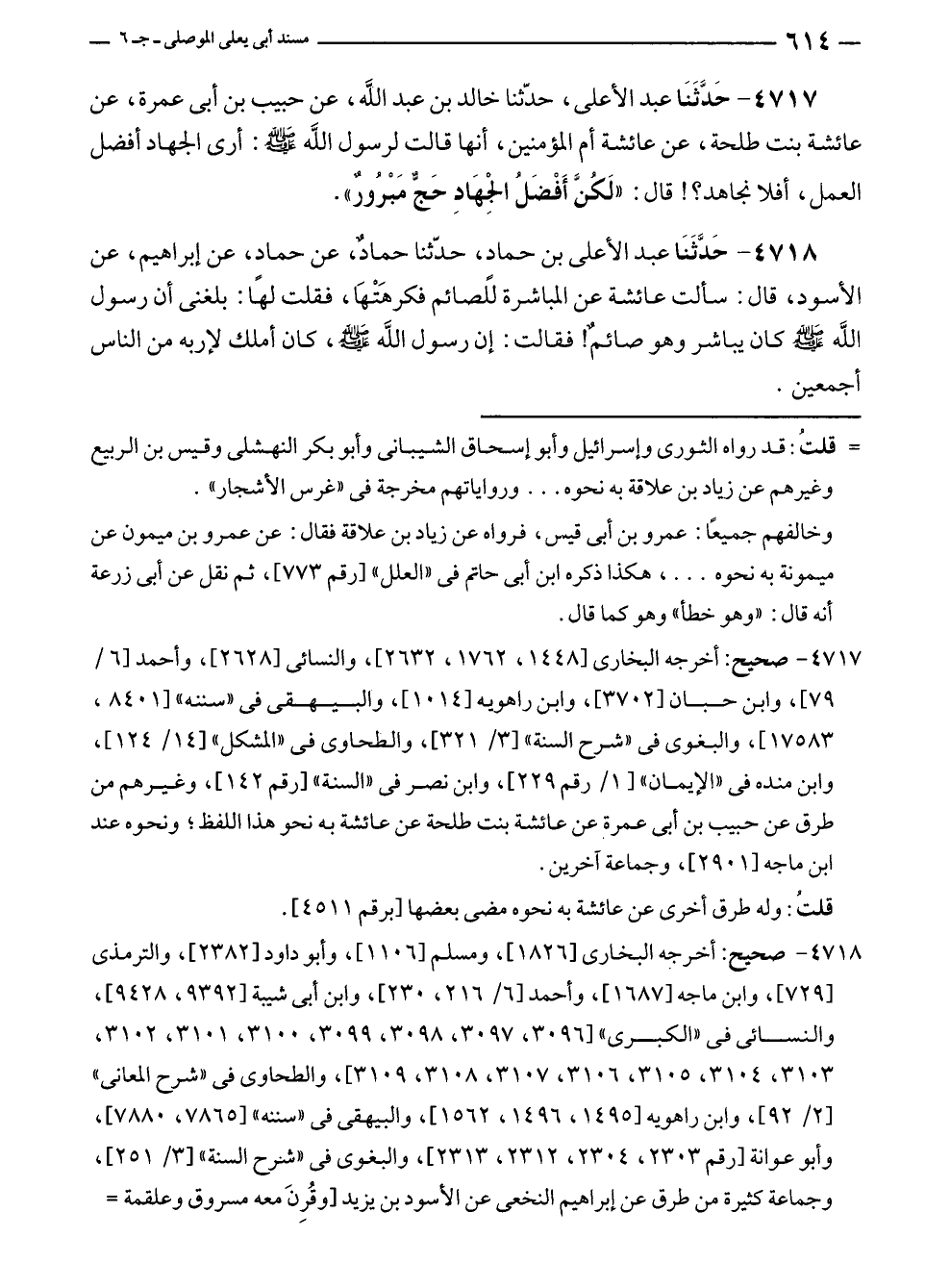 ٤٧١٧ - حَدَّثَنَا عبد الأعلى، حدّثنا خالد بن عبد الله، عن حبيب بن أبي عمرة، عن عائشة بنت طلحة، عن عائشة أم المؤمنين، أنها قالت لرسول الله - صلى الله عليه وسلم -: أرى الجهاد أفضل العمل، أفلا نجاهد؟! قال: "لَكُنَّ أَفْضَلُ الجِهَادِ حَجٌّ مَبْرُورٌ".