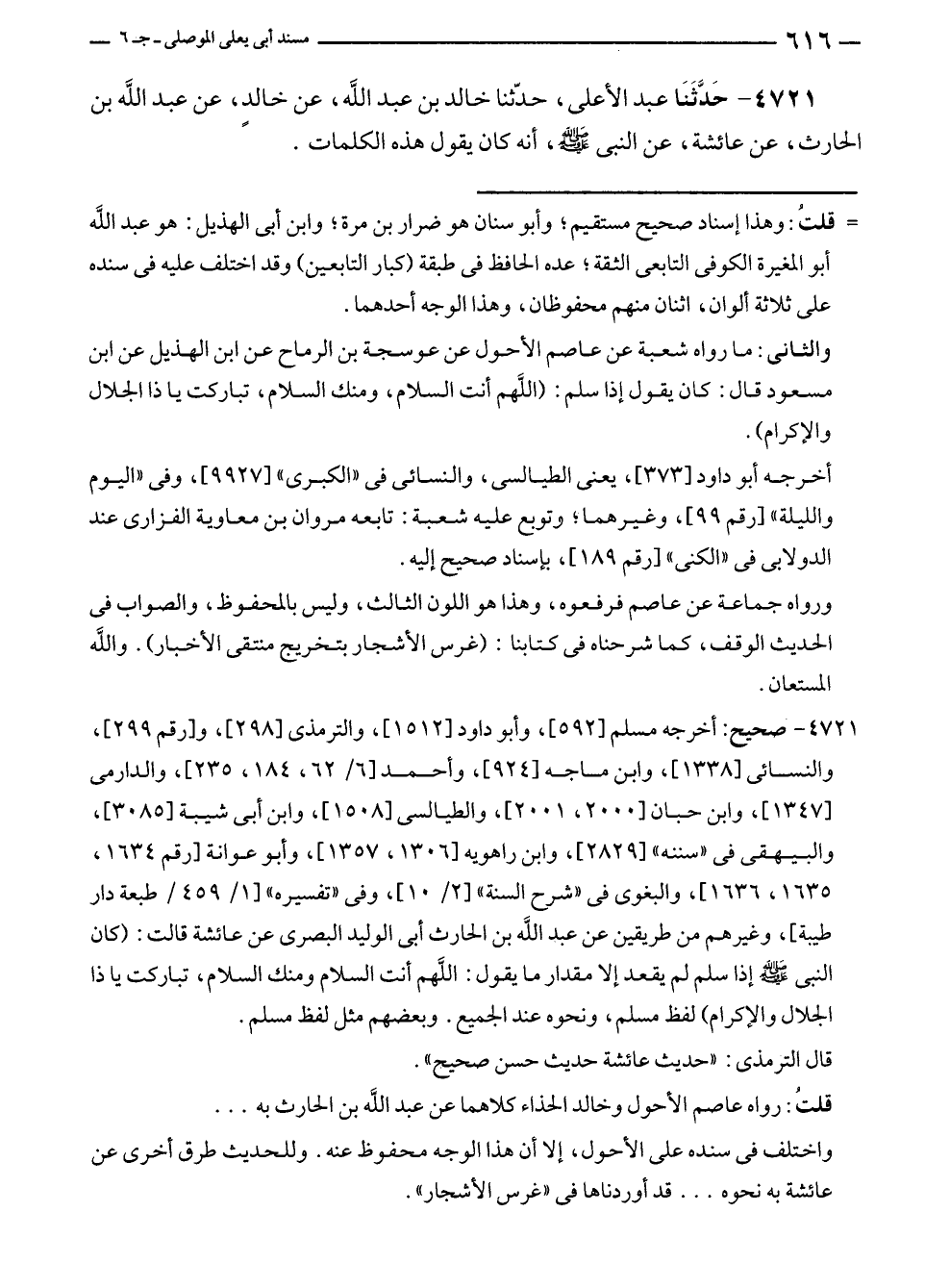 ٤٧٢١ - صحيح: أخرجه مسلم [٥٩٢]، وأبو داود [١٥١٢]، والترمذي [٢٩٨]، و [رقم ٢٩٩]، والنسائي [١٣٣٨]، وابن ماجه [٩٢٤]، وأحمد [٦/ ٦٢، ١٨٤، ٢٣٥]، والدارمي [١٣٤٧]، وابن حبان [٢٠٠٠، ٢٥٠١]، والطيالسي [١٥٠٨]، وابن أبي شيبة [٣٠٨٥]، والبيهقي في "سننه" [٢٨٢٩]، وابن راهويه [١٣٠٦، ١٣٥٧]، وأبو عوانة [رقم ١٦٣٤، ١٦٣٥، ١٦٣٦]، والبغوي في "شرح السنة" [٢/ ١٠]، وفى "تفسيره" [١/ ٤٥٩/ طبعة دار طيبة]، وغيرهم من طريقين عن عبد الله بن الحارث أبي الوليد البصري عن عائشة قالت: (كان النبي - صلى الله عليه وسلم - إذا سلم لم يقعد إلا مقدار ما يقول: اللَّهم أنت السلام ومنك السلام، تباركت يا ذا الجلال والإكرام) لفظ مسلم، ونحوه عند الجميع. وبعضهم مثل لفظ مسلم.