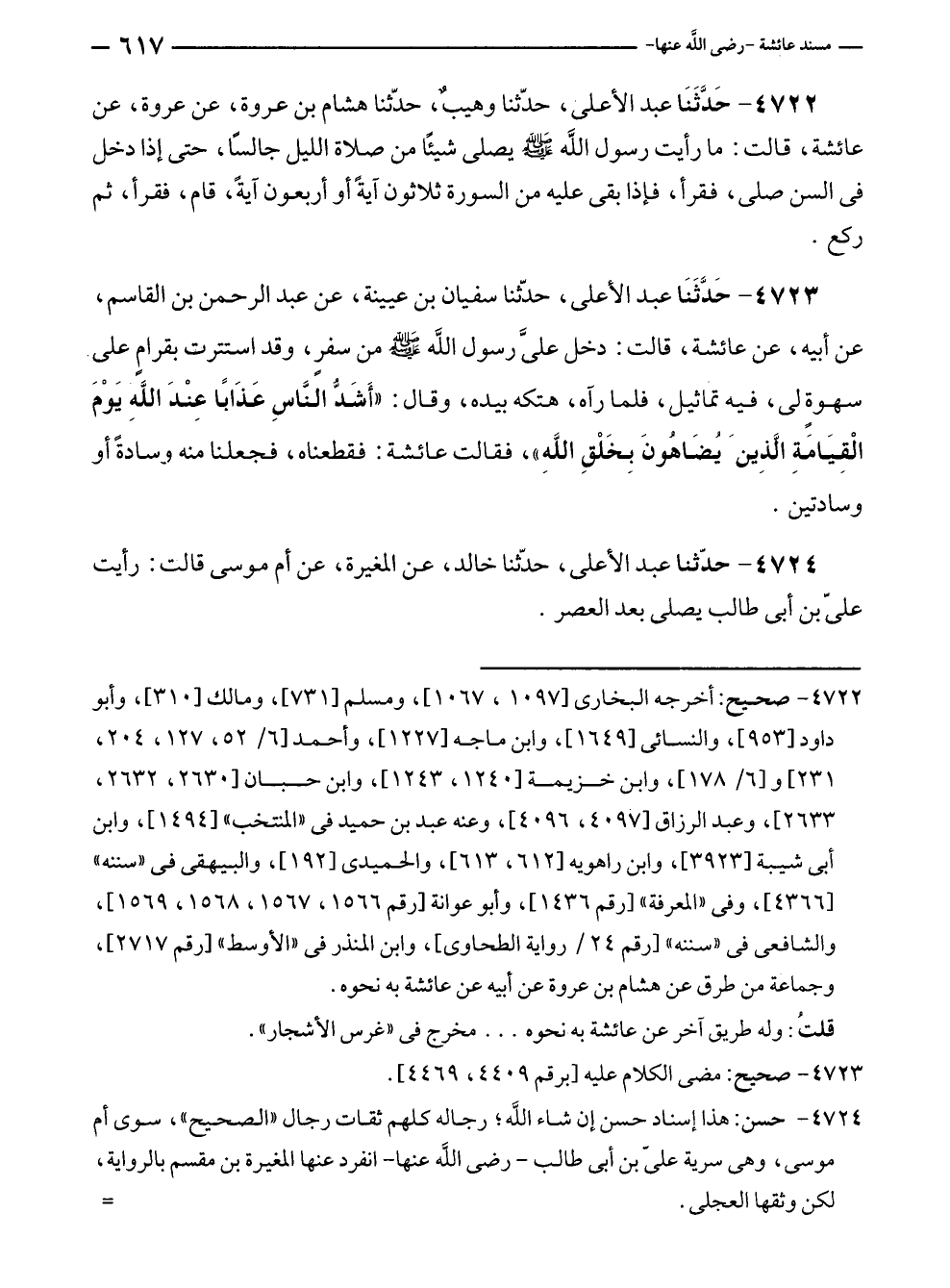 ٤٧٢٤ - حدّثنا عبد الأعلى، حدّثنا خالد، عن المغيرة، عن أم موسى قالت: رأيت عليّ بن أبي طالب يصلى بعد العصر.