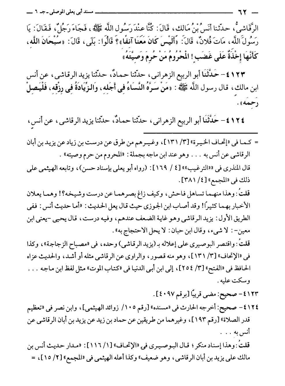 ٤١٢٣ - حَدَّثَنَا أبو الربيع الزهراني، حدّثنا حماد، حدّثنا يزيد الرقاشي، عن أنس بن مِالكٍ، قال رسول الله - صلى الله عليه وسلم -: "مَنْ سَرَّهُ النَّسَاءُ فِي أَجَلِهِ، وَالزِّيَادَةُ فِي رِزْقِهِ، فَلْيَصِلْ رحِمه".