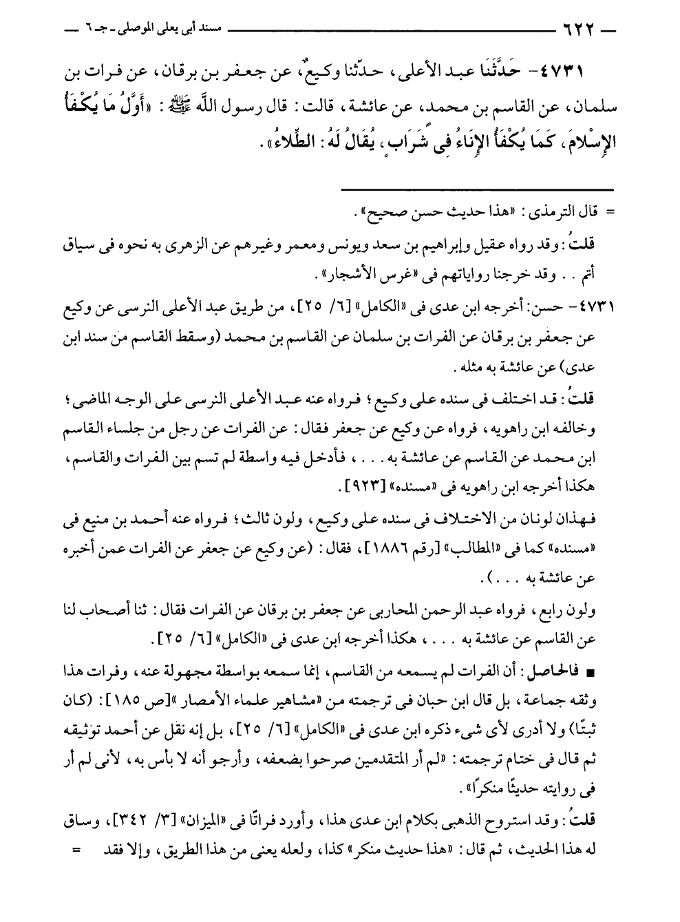 قلتُ: قد اختلف في سنده على وكيع؛ فرواه عنه عبد الأعلى النرسي على الوجه الماضي؛ وخالفه ابن راهويه، فرواه عن وكيع عن جعفر فقال: عن الفرات عن رجل من جلساء القاسم بن محمد عن القاسم عن عائشة به ... ، فأدخل فيه واسطة لم تسم بين الفرات والقاسم، هكذا أخرجه ابن راهويه في "مسنده" [٩٢٣].