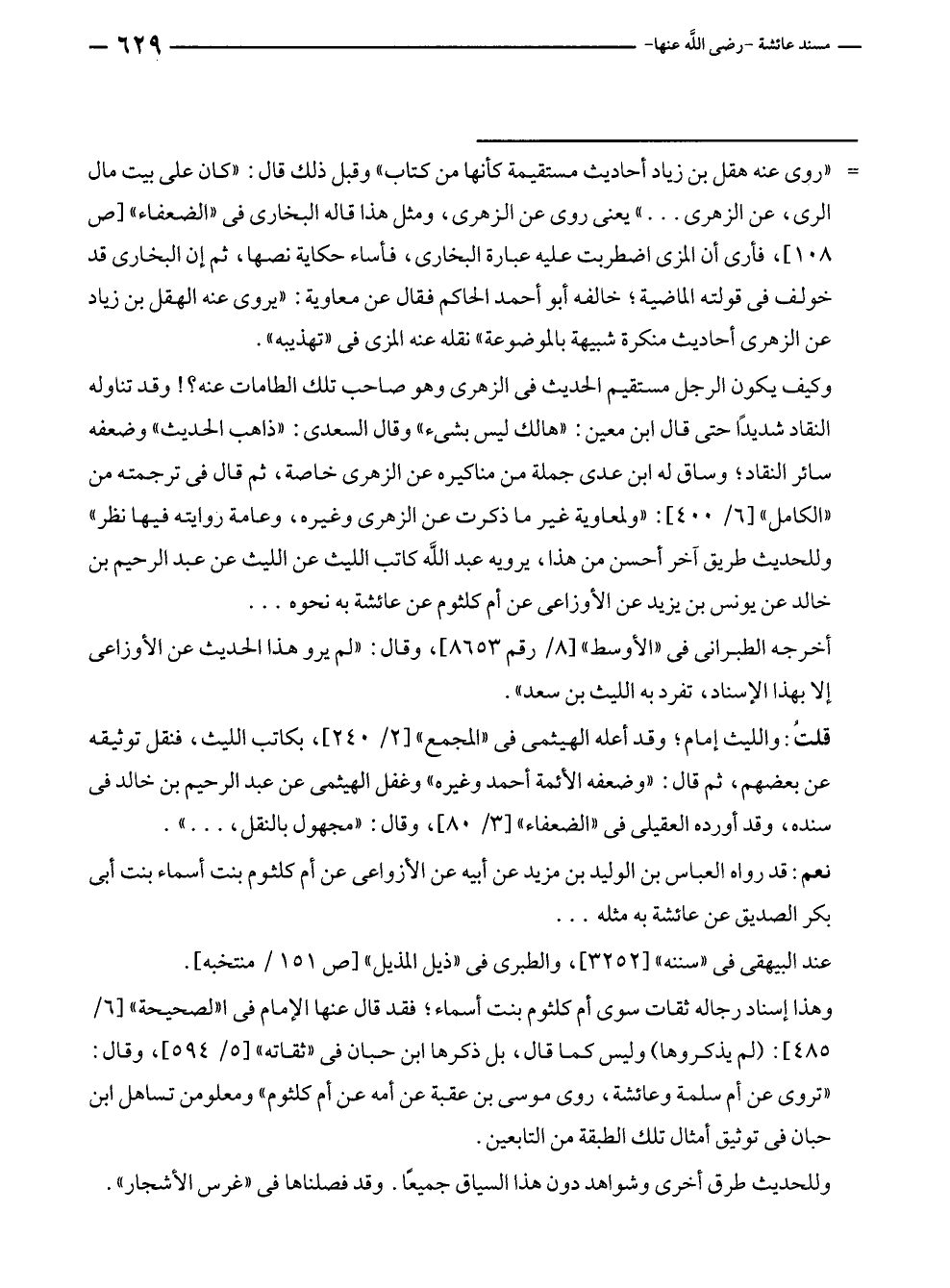 وكيف يكون الرجل مستقيم الحديث في الزهري وهو صاحب تلك الطامات عنه؟! وقد تناوله النقاد شديدًا حتى قال ابن معين: "هالك ليس بشيء" وقال السعدي: "ذاهب الحديث" وضعفه سائر النقاد، وساق له ابن عدي جملة من مناكيره عن الزهري خاصة، ثم قال في ترجمته من "الكامل" [٦/ ٤٠٠]: "ولمعاوية غير ما ذكرت عن الزهري وغيره، وعامة روايته فيها نظر" وللحديث طريق آخر أحسن من هذا، يرويه عبد الله كاتب الليث عن الليث عن عبد الرحيم بن خالد عن يونس بن يزيد عن الأوزاعي عن أم كلثوم عن عائشة به نحوه ...