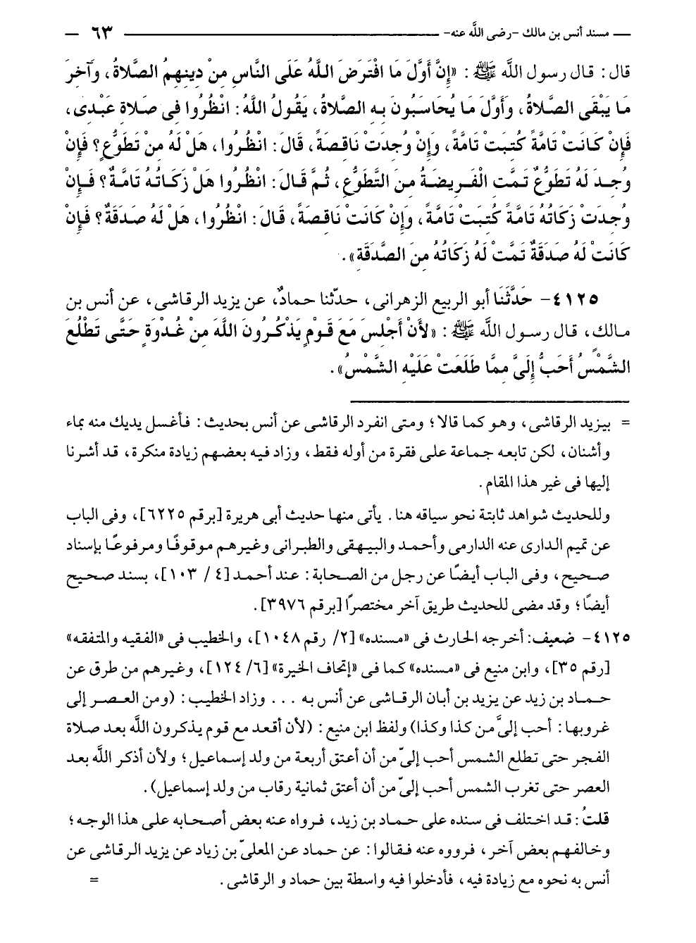 ٤١٢٥ - حَدَّثَنَا أبو الربيع الزهراني، حدّثنا حمادٌ، عن يزيد الرقاشي، عن أنس بن مالك، قال رسول الله - صلى الله عليه وسلم -: "لأَنْ أَجْلِسَ مَعَ قَوْمٍ يَذْكُرُونَ اللَّهَ مِنْ غُدْوَةٍ حَتَّى تَطْلُعَ الشَّمْسُ أَحَبّ إلَيَّ مِمَّا طَلَعَتْ عَلَيْهِ الشَّمْسُ".