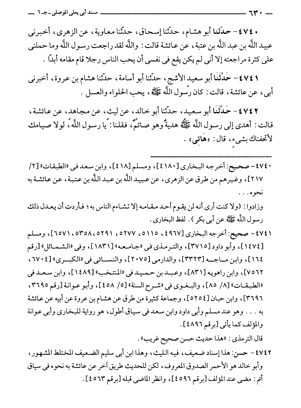 ٤٧٤٠ - حدّثنا أبو هشام، حدّثنا إسحاق، حدّثنا معاوية، عن الزهري، أخبرني عبيد الله بن عبد الله بن عتبة، عن عائشة قالت: واللَّه لقد راجعت رسول الله وما حملني على كثرة مراجعته إلا أنى لم يكن يقع في نفسى أن يحب الناس رجلا قام مقامه أبدًا.