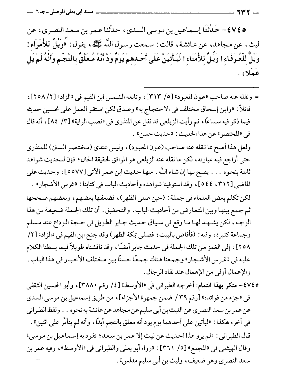 ٤٧٤٥ - حَدَّثَنَا إسماعيل بن موسى السدي، حدّثنا عمر بن سعد النصري، عن ليث، عن مجاهد، عن عائشة، قالت: سمعت رسول الله - صلى الله عليه وسلم -، يقول: "وَيْلٌ للأُمَرَاءِ! وَيْلٌ لِلْعُرَفَاءِ! وَيلٌ لِلأُمَنَاءِ! لَيأْتِيَنَّ عَلَى أَحَدِهِمْ يَوْمٌ وَدَّ أَنَّهُ مُعَلَّقٌ بِالنَّجْمِ وَأَنَّهُ لَمْ يَلِ عَمَلا".