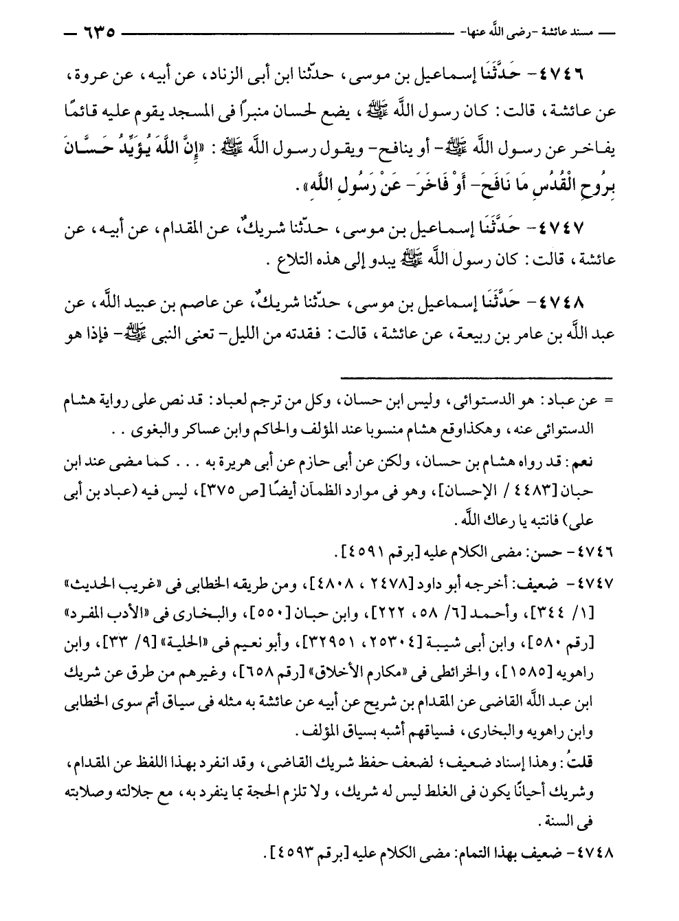 ٤٧٤٦ - حَدَّثَنَا إسماعيل بن موسى، حدّثنا ابن أبي الزناد، عن أبيه، عن عروة، عن عائشة، قالت: كان رسول الله - صلى الله عليه وسلم -، يضع لحسان منبرًا في المسجد يقوم عليه قائمًا يفاخر عن رسول الله - صلى الله عليه وسلم - - أو ينافح - ويقول رسول الله - صلى الله عليه وسلم -: "إنَّ اللَّهَ يُؤَيِّدُ حَسَّانَ بِروحِ الْقُدُسِ مَا نَافَحَ - أَوْ فَاخَرَ - عَنْ رَسُولِ اللَّهِ".