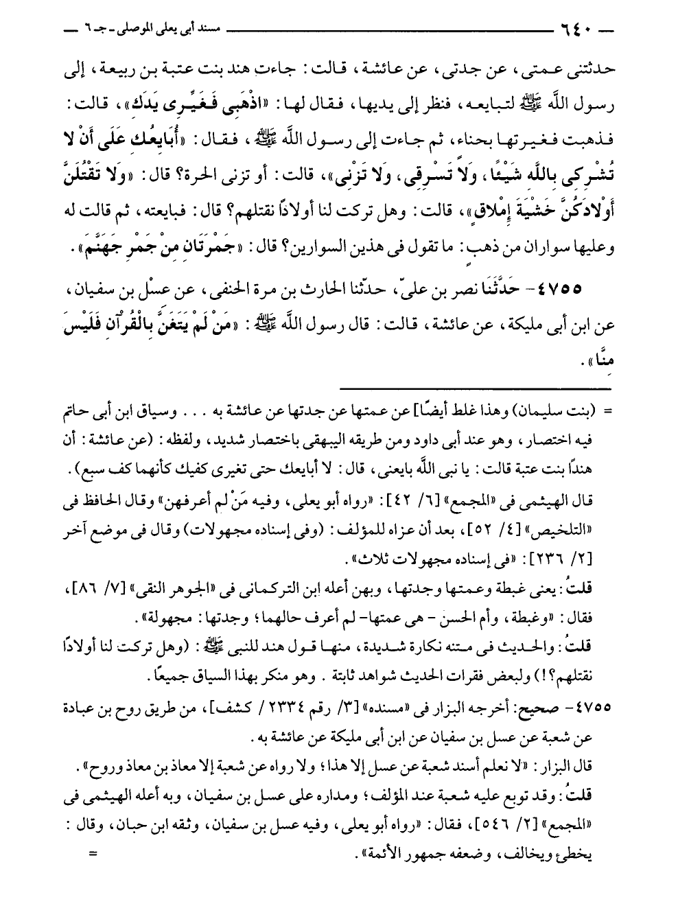 قال الهيثمي في "المجمع" [٦/ ٤٢]: "رواه أبو يعلى، وفيه مَنْ لم أعرفهن" وقال الحافظ في "التلخيص" [٤/ ٥٢]، بعد أن عزاه للمؤلف: (وفى إسناده مجهولات) وقال في موضع آخر [٢/ ٢٣٦]: "في إسناده مجهولات ثلاث".