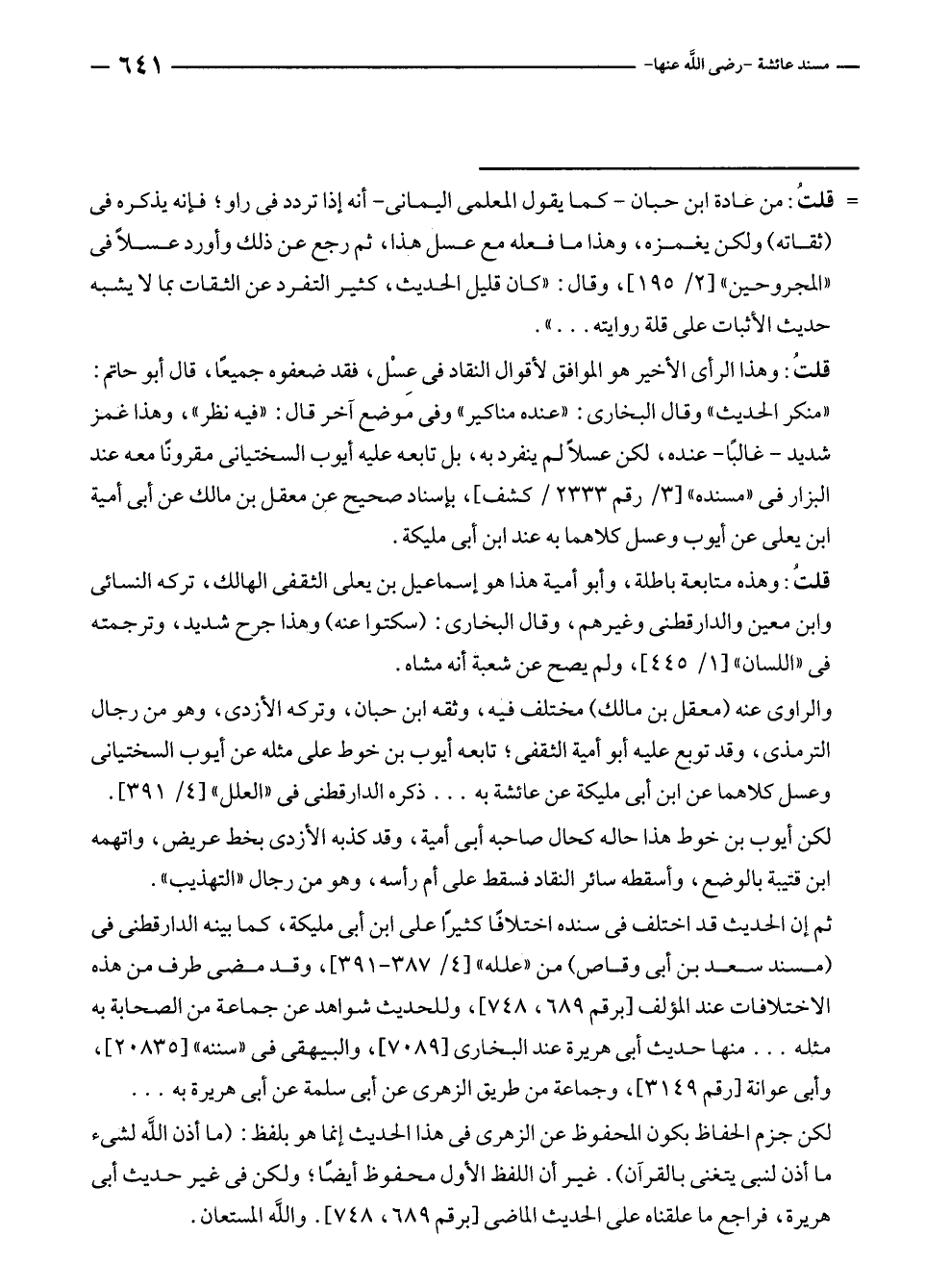 قلتُ: وهذا الرأى الأخير هو الموافق لأقوال النقاد في عِسْل، فقد ضعفوه جميعًا، قال أبو حاتم: "منكر الحديث" وقال البخاري: "عنده مناكير" وفى موضع آخر قال: "فيه نظر"، وهذا غمز شديد - غالبًا - عنده، لكن عسلًا لم ينفرد به، بل تابعه عليه أيوب السختياني مقرونًا معه عند البزار في "مسنده" [٣/ رقم ٢٣٣٣/ كشف]، بإسناد صحيح عن معقل بن مالك عن أبي أمية بن يعلى عن أيوب وعسل كلاهما به عند ابن أبي مليكة.