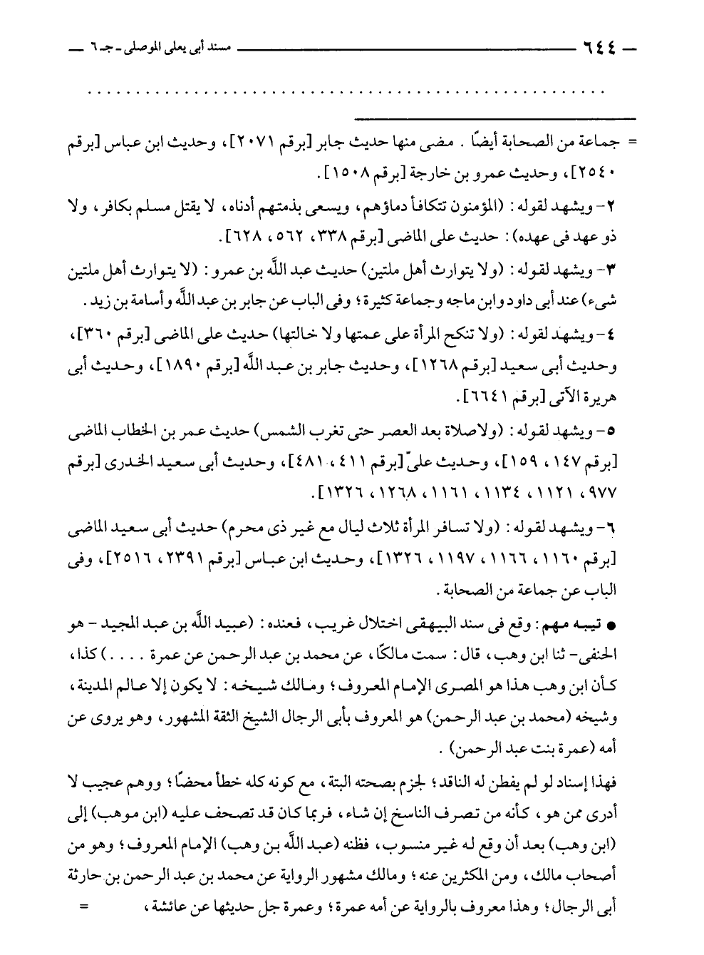 • تنبيه مهم: وقع في سند البيهقى اختلال غريب، فعنده: (عبيد الله بن عبد المجيد - هو الحنفى - ثنا ابن وهب، قال: سمت مالكًا، عن محمد بن عبد الرحمن عن عمرة .... ) كذا، كأن ابن وهب هذا هو المصرى الإمام المعروف؛ ومالك شيخه: لا يكون إلا عالم المدينة، وشيخه (محمد بن عبد الرحمن) هو المعروف بأبى الرجال الشيخ الثقة المشهور، وهو يروى عن أمه (عمرة بنت عبد الرحمن).
