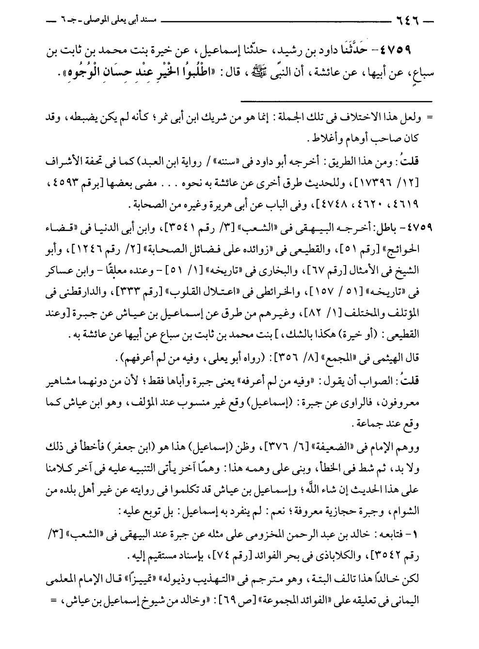 ٤٧٥٩ - حَدَّثَنَا داود بن رشيدٍ، حدّثنا إسماعيل، عن خيرة بنت محمد بن ثابت بن سباعٍ، عن أبيها، عن عائشة، أن النبي - صلى الله عليه وسلم -، قال: "اطْلُبوُا الْخَيْرِ عِنْدِ حِسَانِ الْوُجُوهِ".