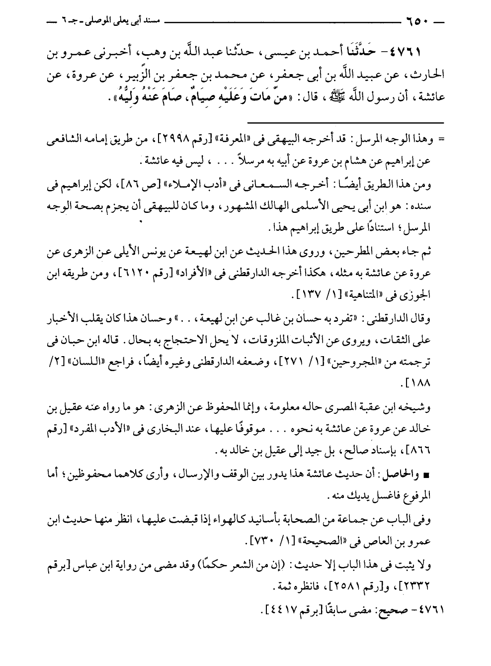 ٤٧٦١ - حَدَّثَنَا أحمد بن عيسى، حدّثنا عبد الله بن وهبٍ، أخبرني عمرو بن الحارث، عن عبيد الله بن أبي جعفر، عن محمد بن جعفر بن الزبير، عن عروة، عن عائشة، أن رسول الله - صلى الله عليه وسلم -، قال: "من مَات وَعَلَيْهِ صِيَامٌ، صَامَ عَنْه وَلِيُّهُ".