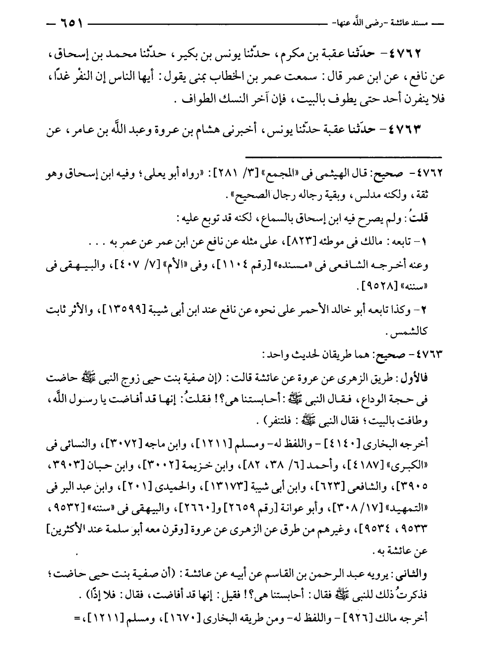 ٤٧٦٢ - حدّثنا عقبة بن مكرم، حدّثنا يونس بن بكير، حدّثنا محمد بن إسحاق، عن نافع، عن ابن عمر قال: سمعت عمر بن الخطاب بمنى يقول: أيها الناس إن النفْر غدًا، فلا ينفرن أحد حتى يطوف بالبيت، فإن آخر النسك الطواف.