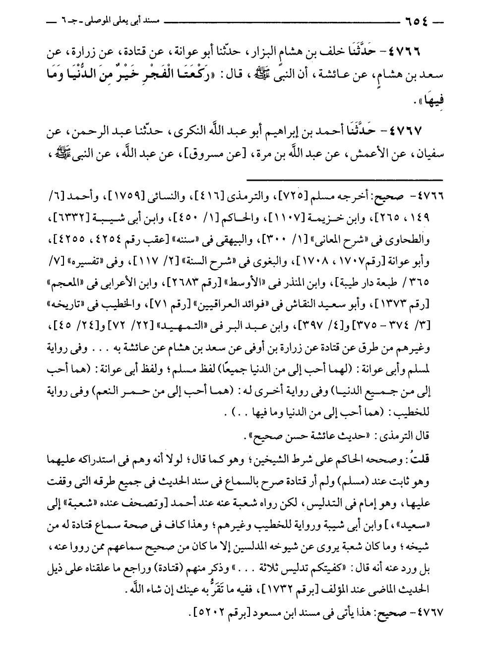 ٤٧٦٦ - حَدَّثَنَا خلف بن هشامٍ البزار، حدّثنا أبو عوانة، عن قتادة، عن زرارة، عن سعد بن هشامٍ، عن عائشة، أن النبي - صلى الله عليه وسلم -، قال: "رَكْعَتَا الْفَجْرِ خَيْرٌ مِنَ الدُّنْيَا وَمَا فِيهَا".