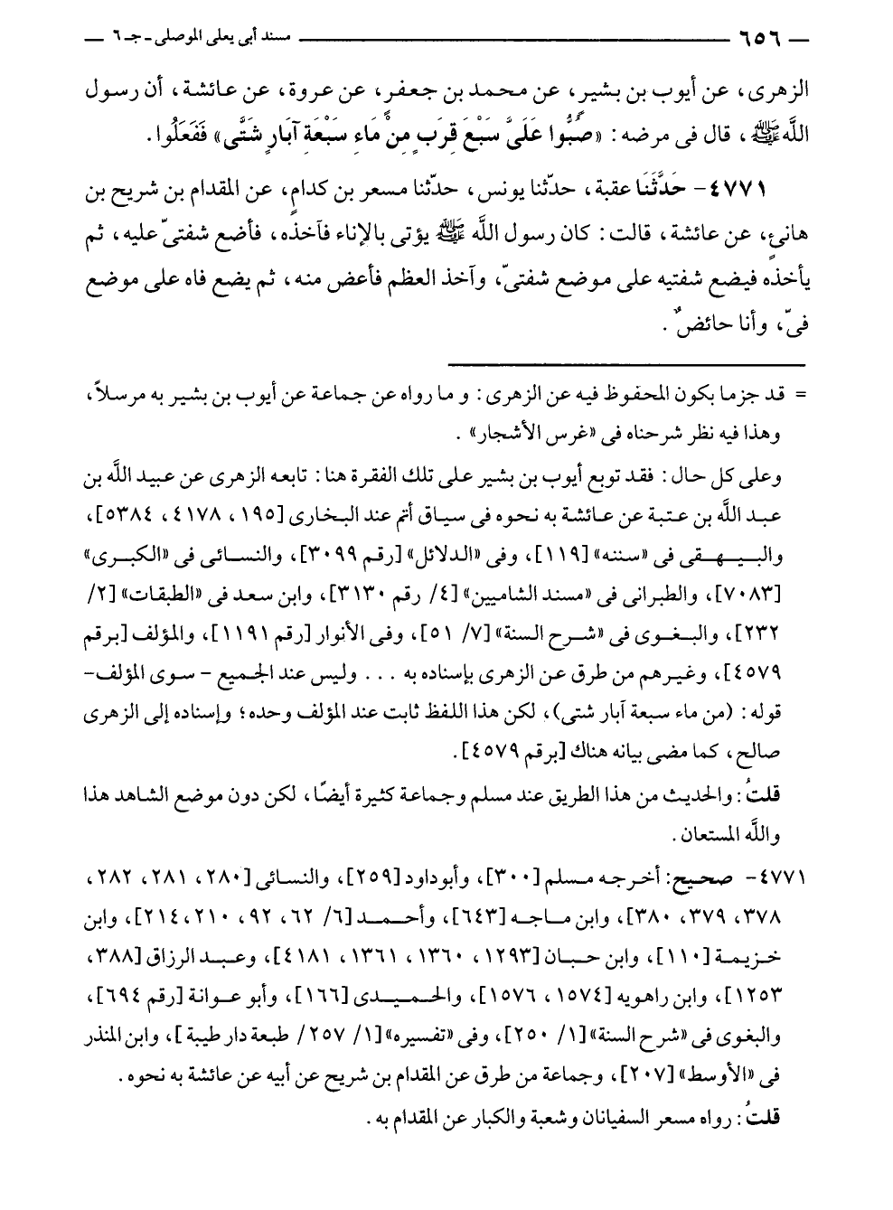 وعلى كل حال: فقد توبع أيوب بن بشير على تلك الفقرة هنا: تابعه الزهري عن عبيد الله بن عبد الله بن عتبة عن عائشة به نحوه في سياق أتم عند البخاري [١٩٥، ٤١٧٨، ٥٣٨٤]، والبيهقي في "سننه" [١١٩]، وفى "الدلائل" [رقم ٣٠٩٩]، والنسائي في "الكبرى" [٧٠٨٣]، والطبراني في "مسند الشاميين" [٤/ رقم ٣١٣٠]، وابن سعد في "الطبقات" [٢/ ٢٣٢]، والبغوي في "شرح السنة" [٧/ ٥١]، وفى الأنوار [رقم ١١٩١]، والمؤلف [برقم ٤٥٧٩]، وغيرهم من طرق عن الزهري بإسناده به ... وليس عند الجميع - سوى المؤلف - قوله: (من ماء سبعة آبار شتى)، لكن هذا اللفظ ثابت عند المؤلف وحده؛ وإسناده إلى الزهري صالح، كما مضى بيانه هناك [برقم ٤٥٧٩].