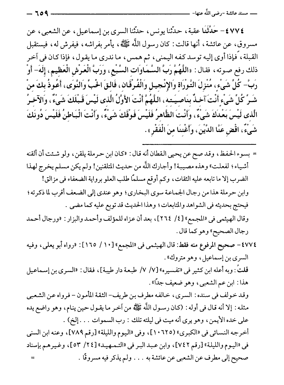 ٤٧٧٤ - حَدَّثَنَا عقبة، حدّثنا يونس، حدّثنا السري بن إسماعيل، عن الشعبي، عن مسروقٍ، عن عائشة، أنها قالت: كان رسول الله - صلى الله عليه وسلم -، يأمر بفراشه، فيفرش له، فيستقبل القبلة، فإذا أوى إليه توسد كفه اليمنى، ثم همس، ما ندرى ما يقول، فإذا كان في آخر ذلك رفع صوته، فقال: "اللَّهُمَّ رَبَّ - السَّمَاوَاتِ السَّبْع، وَرَبَّ الْعَرْشِ الْعَظِيمِ، إِلَهَ - أَوْ رَبَّ - كُلِّ شَيْءٍ، مُنْزِلَ التَّوْرَاةِ وَالإِنْجِيلِ وَالْفُرْقَانِ، فَالِقَ الحبِّ وَالنَّوَى، أَعُوذُ بِكَ مِنْ شَرِّ كُلِّ شَيْءٍ أَنْتَ آخِذٌ بِنَاصِيَتِه، اللَّهُمَّ أَنْتَ الأَوَّلُ الَّذي لَيْسَ قَبْلَكَ شَيْءٌ، وَالآخِرُ الَّذِي لَيْسَ بَعْدَكَ شَيْءٌ، وَأَنْتَ الظَّاهِرُ فَلَيْسَ فَوْقَكَ شَيْءٌ، وَأَنْتَ الْبَاطِنُ فَلَيْسَ دُونَكَ شَيْءٌ، اقْضِ عَنَّا الدَّيْنَ، وَأَغْنِنَا مِنَ الْفَقْرِ".