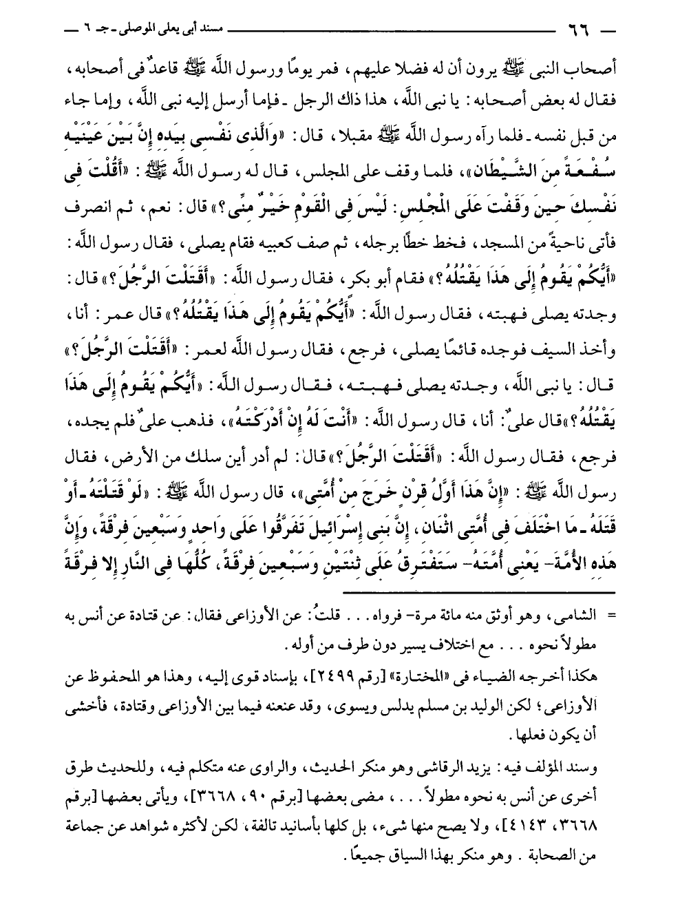 وسند المؤلف فيه: يزيد الرقاشي وهو منكر الحديث، والراوى عنه متكلم فيه، وللحديث طرق أخرى عن أنس به نحوه مطولًا ... ، مضى بعضها [برقم ٩٠، ٣٦٦٨]، ويأتى بعضها [برقم ٣٦٦٨، ٤١٤٣]، ولا يصح منها شيء، بل كلها بأسانيد تالفة، لكن لأكثره شواهد عن جماعة من الصحابة. وهو منكر بهذا السياق جميعًا.