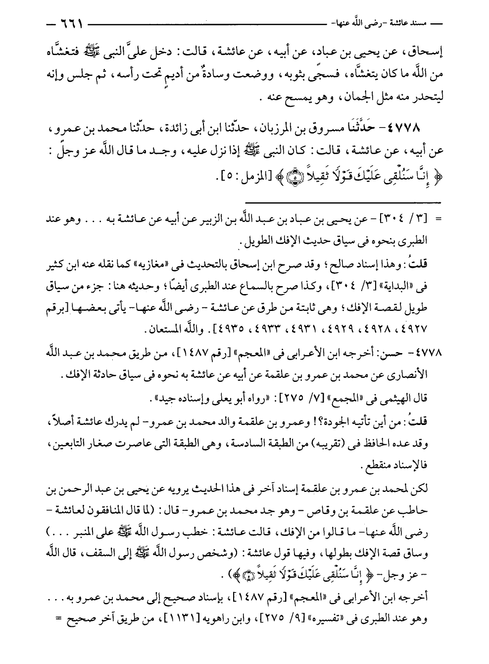 ٤٧٧٨ - حَدَّثَنَا مسروق بن المرزبان، حدّثنا ابن أبي زائدة، حدّثنا محمد بن عمرٍو، عن أبيه، عن عائشة، قالت: كان النبي - صلى الله عليه وسلم - إذا نزل عليه، وجد ما قال الله عز وجل: {إِنَّا سَنُلْقِي عَلَيْكَ قَوْلًا ثَقِيلًا (٥)} [المزمل: ٥].