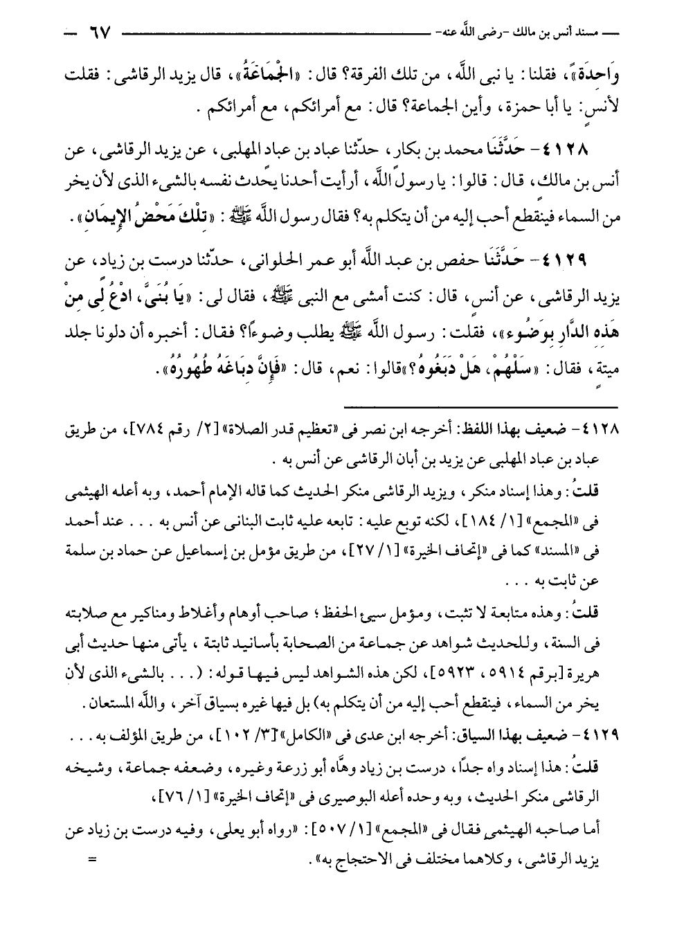 قلتُ: وهذا إسناد منكر، ويزيد الرقاشي منكر الحديث كما قاله الإمام أحمد، وبه أعله الهيثمي في "المجمع" [١/ ١٨٤]، لكنه توبع عليه: تابعه عليه ثابت البناني عن أنس به ... عند أحمد في "المسند" كما في "إتحاف الخيرة" [١/ ٢٧]، من طريق مؤمل بن إسماعيل عن حماد بن سلمة عن ثابت به ...
