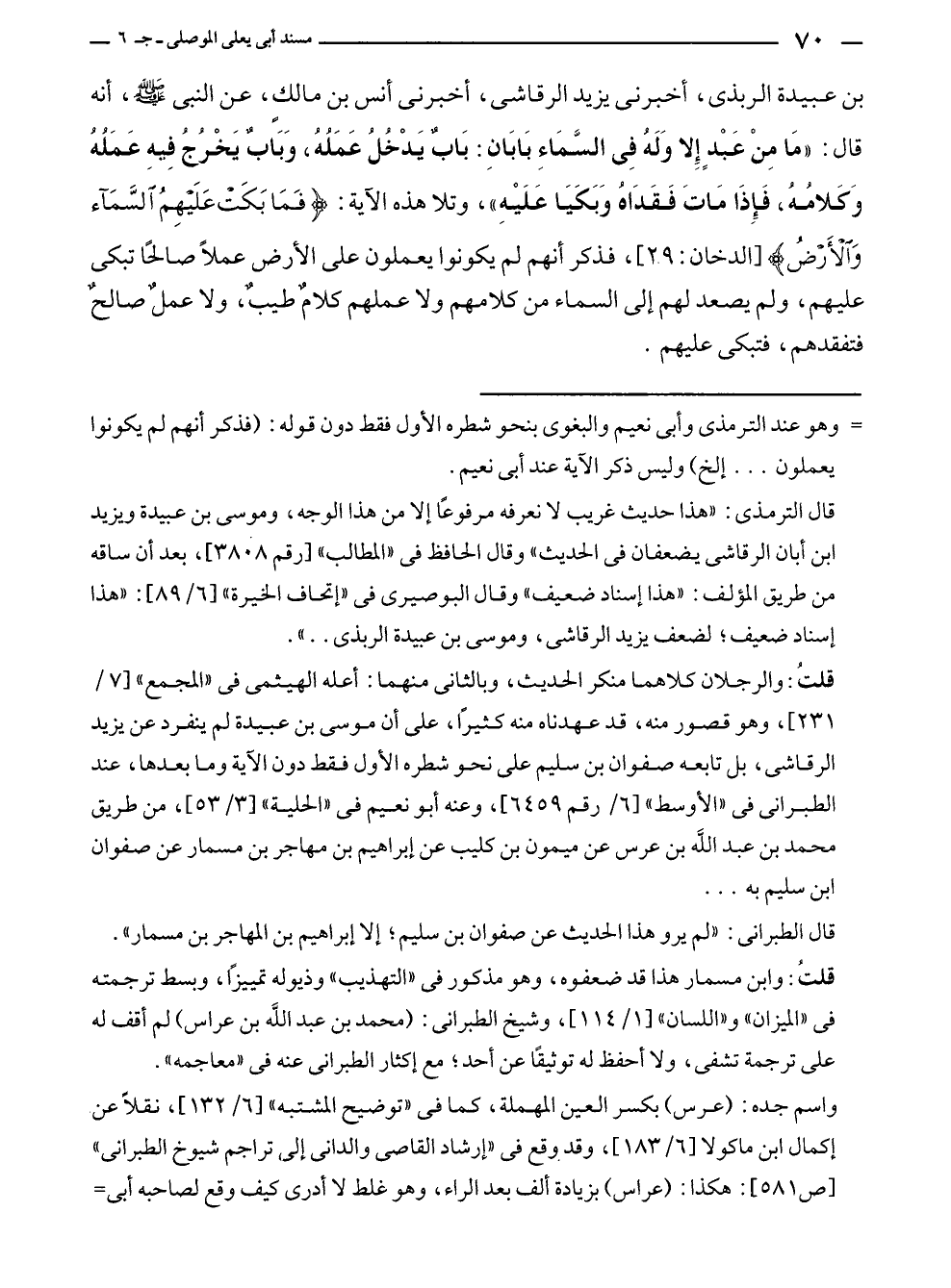 بن عبيدة الربذى، أخبرنى يزيد الرقاشي، أخبرنى أنس بن مالكٍ، عن النبي - صلى الله عليه وسلم -، أنه قال: "مَا مِنْ عَبْدٍ إِلا وَلَهُ فِي السَّمَاءِ بَابَانِ: بَابٌ يَدْخُلُ عَمَلُهُ، وَبَابٌ يَخْرُجُ فِيهِ عَمَلُهُ وَكَلامُهُ، فَإِذَا مَاتَ فَقَدَاهُ وَبَكَيَا عَلَيْهِ"، وتلا هذه الآية: {فَمَا بَكَتْ عَلَيْهِمُ السَّمَاءُ وَالْأَرْضُ} [الدخان: ٢٠٩]، فذكر أنهم لم يكونوا يعملون على الأرض عملًا صالحًا تبكى عليهم، ولم يصعد لهم إلى السماء من كلامهم ولا عملهم كلامٌ طيبٌ، ولا عملٌ صالحٌ فتفقدهم، فتبكى عليهم.
