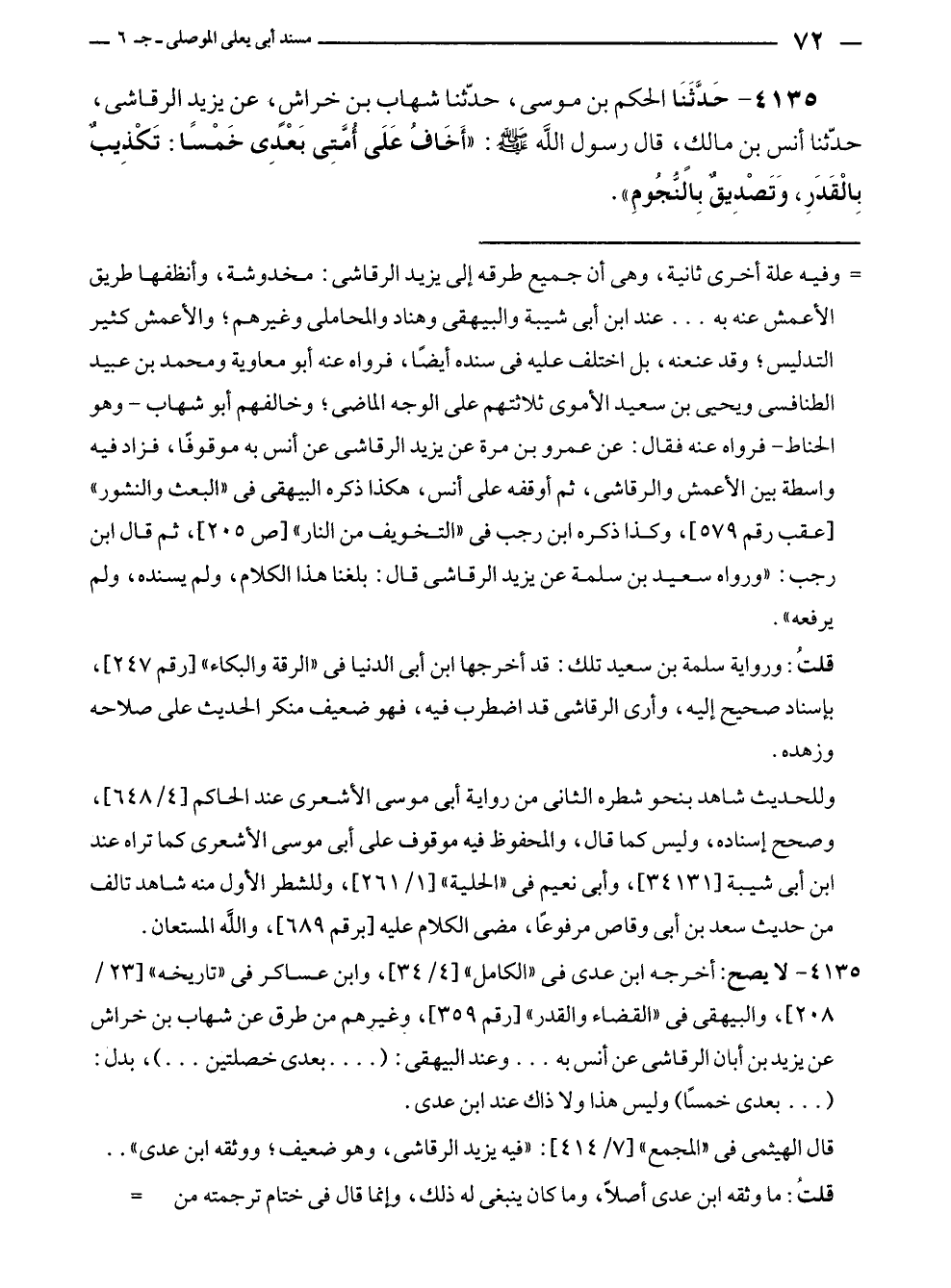 ٤١٣٥ - حَدَّثَنَا الحكم بن موسى، حدّثنا شهاب بن خراشٍ، عن يزيد الرقاشي، حدّثنا أنس بن مالكٍ، قال رسول الله - صلى الله عليه وسلم -: "أَخَافُ عَلَى أُمَّتِى بَعْدِى خَمْسًا: تَكْذِيبٌ بِالْقَدَرِ، وَتَصْدِيقٌ بِالنُّجُومِ".