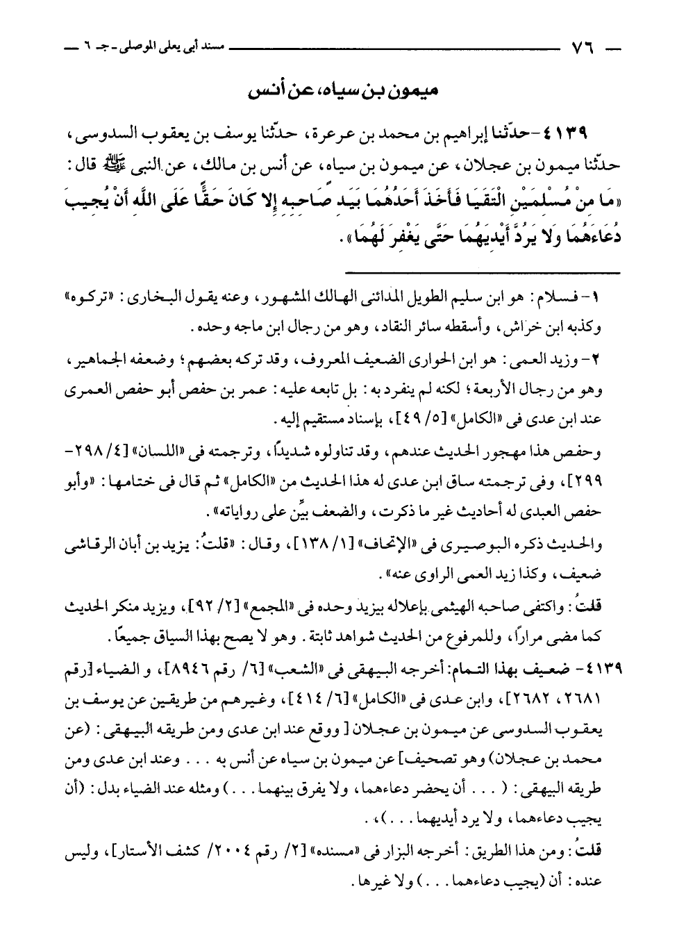 ٤١٣٩ - حدّثنا إبراهيم بن محمد بن عرعرة، حدّثنا يوسف بن يعقوب السدوسى، حدّثنا ميمون بن عجلان، عن ميمون بن سياهٍ، عن أنس بن مالك، عن النبي - صلى الله عليه وسلم - قال: "مَا مِنْ مُسْلِمَيْنِ الْتَقَيَا فَأَخَذَ أَحَدُهُمَا بَيَدِ صَاحِبِهِ إِلا كَانَ حَقًّا عَلَى اللَّهِ أَنْ يُجِيبَ دُعَاءَهُمَا وَلا يَرُدَّ أَيْدِيَهُمَا حَتَّى يَغْفِرَ لَهُمَا".