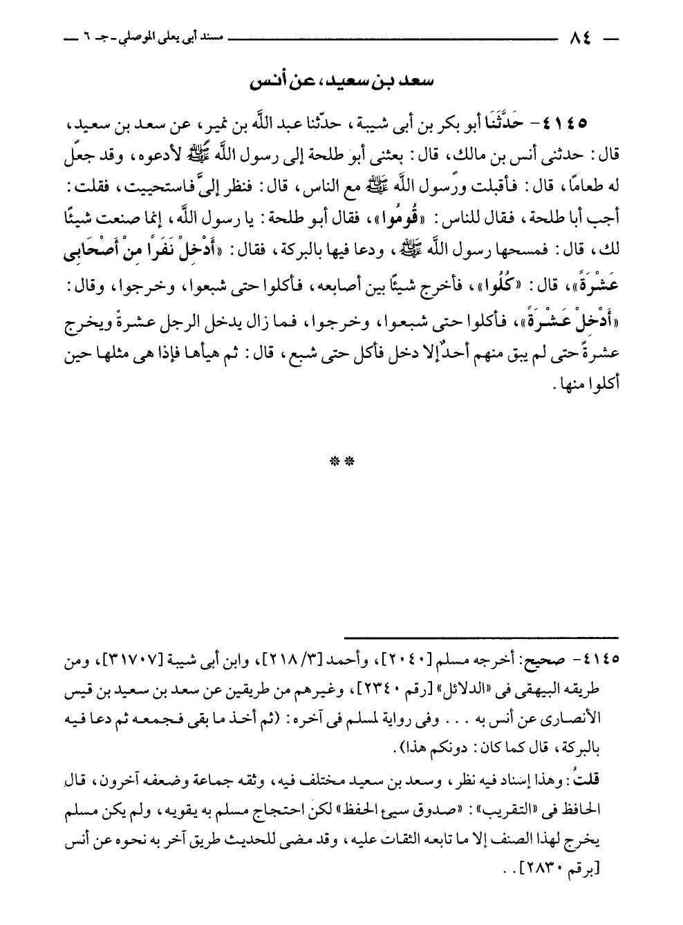 ٤١٤٥ - حَدَّثَنَا أبو بكر بن أبي شيبة، حدّثنا عبد الله بن نمير، عن سعد بن سعيدٍ، قال: حدثنى أنس بن مالكٍ، قال: بعثنى أبو طلحة إلى رسول الله - صلى الله عليه وسلم - لأدعوه، وقد جعل له طعامًا، قال: فأقبلت ورسول الله - صلى الله عليه وسلم - مع الناس، قال: فنظر إليَّ فاستحييت، فقلت: أجب أبا طلحة، فقال للناس: "قُومُوا"، فقال أبو طلحة: يا رسول الله، إنما صنعت شيئًا لك، قال: فمسحها رسول الله - صلى الله عليه وسلم -، ودعا فيها بالبركة، فقال:". أدْخِلْ نَفَرًا مِنْ أَصْحَابِى عَشْرَةً"، قال: "كُلُوا"، فأخرج شيئًا بين أصابعه، فأكلوا حتى شبعوا، وخرجوا، وقال: "أَدْخِلْ عَشْرَةً"، فأكلوا حتى شبعوا، وخرجوا، فما زال يدخل الرجل عشرةً ويخرج عشرةً حتى لم يبق منهم أحدٌ إلا دخل فأكل حتى شبع، قال: ثم هيأها فإذا هي مثلها حين أكلوا منها.