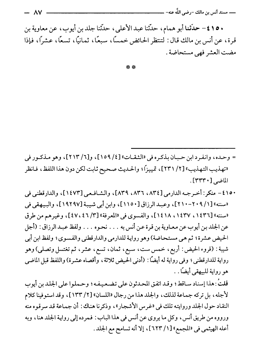 ٤١٥٠ - حدّثنا أبو همام، حدّثنا عبد الأعلى، حدّثنا جلد بن أيوب، عن معاوية بن قرة، عن أنس بن مالك قال: لتنتظر الحائض خمسًا، سبعًا، ثمانيًا، تسعًا، عشرًا، فإذا مضت العشر فهى مستحاضة.