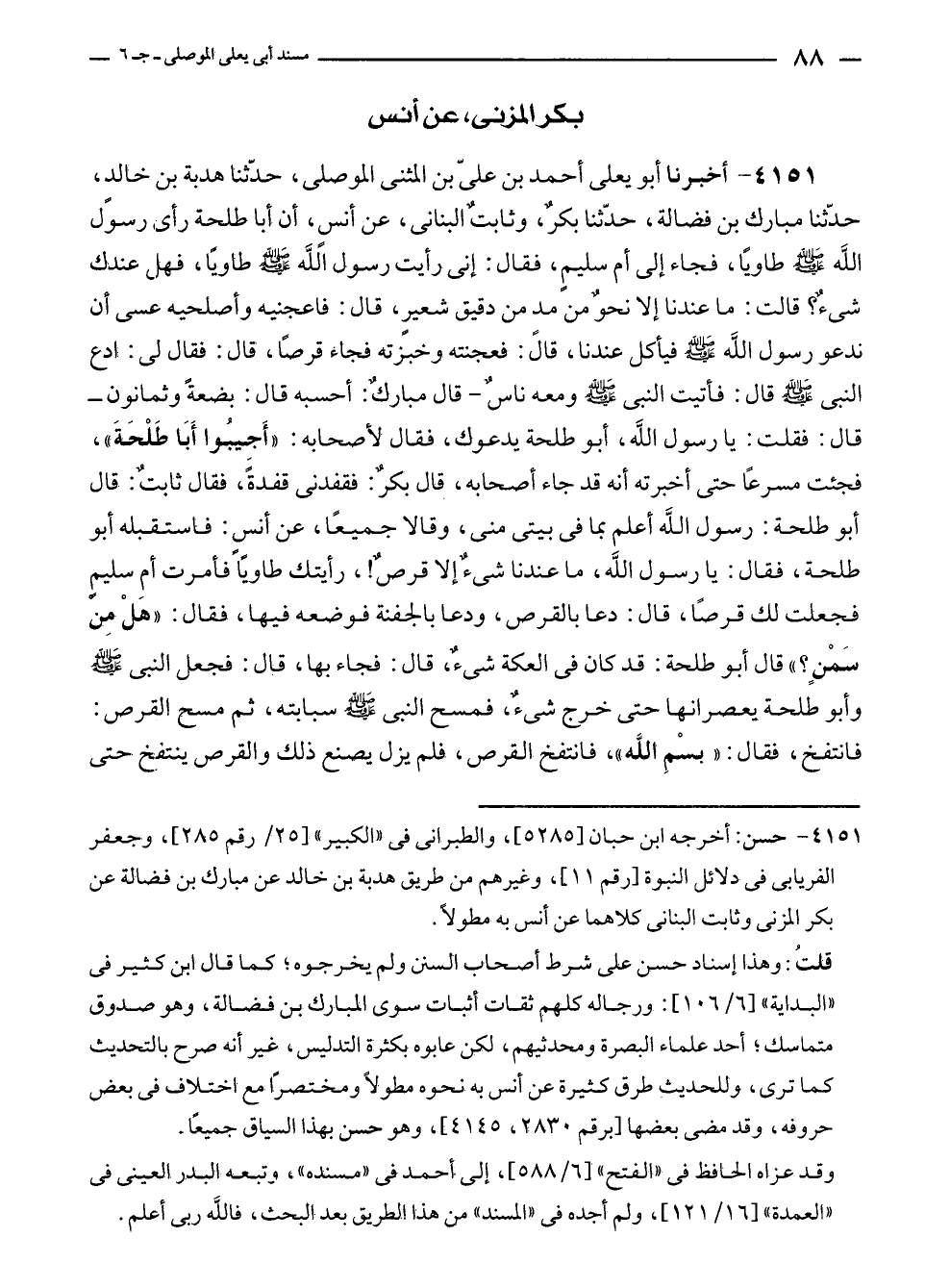 ٤١٥١ - أخبرنا أبو يعلى أحمد بن عليّ بن المثنى الموصلى، حدّثنا هدبة بن خالدٍ، حدّثنا مبارك بن فضالة، حدّثنا بكرٌ، وثابتٌ البناني، عن أنسٍ، أن. أبا طلحة رأى رسول الله - صلى الله عليه وسلم - طاويًا، فجاء إلى أم سليمٍ، فقال: إنى رأيت رسول الله - صلى الله عليه وسلم - طاويًا، فهل، عندك شيءٌ قالت: ما عندنا إلا نحوٌ من مدٍ من دقيق شعيرٍ، قال: فاعجنيه وأصلحيه عسى أن ندعو رسول الله - صلى الله عليه وسلم - فيأكل عندنا، قال: فعجنته وخبزته فجاء قرصًا، قال: فقال لى: ادع النبي - صلى الله عليه وسلم - قال: فأتيت النبي - صلى الله عليه وسلم - ومعه ناسٌ قال مباركٌ: أحسبه قال: بضعةً وثمانون - قال: فقلت: يا رسول الله، أبو طلحة يدعوك، فقال - لأصحابه: "أَجِيبُوا أَبَا طَلْحَةَ"، فجئت مسرعًا حتى أخبرته أنه قد جاء أصحابه، قال بكرٌ: فقفدنى قفدةً، فقال ثابتٌ: قال أبو طلحة: رسول الله أعلم بما في بيتى منى، وقالا جميعًا، عن أنسٍ: فاستقبله أبو طلحة، فقال: يا رسول الله، ما عندنا شئٌ إلا قرصٌ!، رأيتك طاويًا فأمرت أم سليم فجعلت لك قرصًا، قال: دعا بالقرص، ودعا بالجفنة فوضعه فيها، فقال: "هَلْ مِن سَمْنٍ؟ "قال أبو طلحة: قدكان في العكة شئٌ، قال: فجاء بها، قال: فجعل النبي - صلى الله عليه وسلم - وأبو طلحة يعصرانها حتى خرج شئٌ، فمسح النبي - صلى الله عليه وسلم - سبابته، ثم مسح القرص: فانتفخ، فقال: "بسْمِ الله"، فانتفخ القرص، فلم يزل يصنع ذلك والقرص ينتفخ حتى