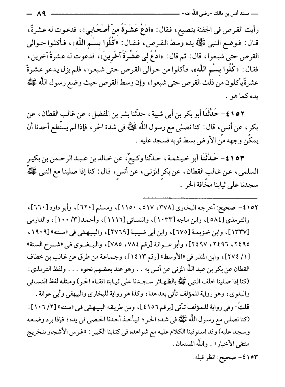 ٤١٥٢ - حَدَّثَنَا أبو بكر بن أبي شيبة، حدّثنا بشر بن المفضل، عن غالبٍ القطان، عن بكرٍ، عن أنسٍ، قال: كنا نصلى مع رسول الله - صلى الله عليه وسلم - في شدة الحر، فإذا لم يستطع أحدنا أن يمكن وجهه من الأرض بسط ثوبه فسجد عليه.