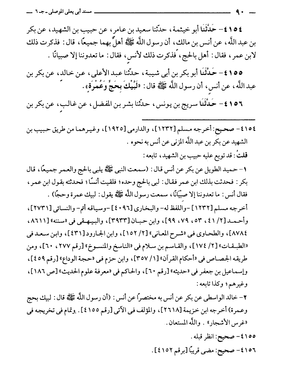 ٤١٥٤ - حَدَّثَنَا أبو خيثمة، حدّثنا سعيد بن عامر، عن حبيب بن الشهيد، عن بكر بن عبد الله، عن أنس بن مالكٍ، أن رسول الله - صلى الله عليه وسلم - أهل بهما جميعًا، قال: فذكرت ذلك لابن عمر، فقال: أهل بالحج، فذكرت ذلك لأنسٍ، فقال: ما تعدوننا إلا صبيانًا.