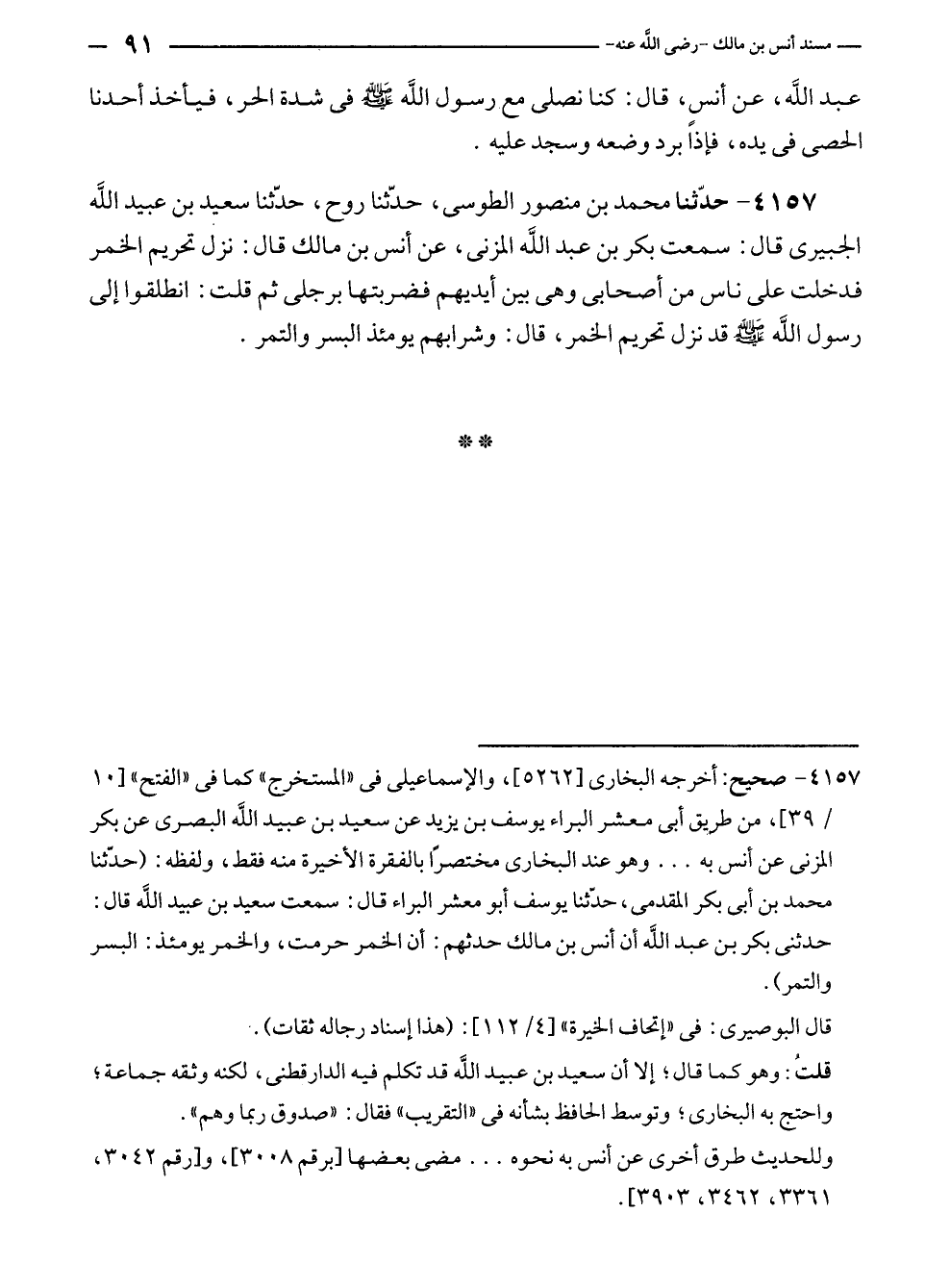 ٤١٥٧ - حدّثنا محمد بن منصور الطوسي، حدّثنا روح، حدّثنا سعيد بن عبيد الله الجبيرى قال: سمعت بكر بن عبد الله المزنى، عن أنس بن مالك قال: نزل تحريم الخمر فدخلت على ناس من أصحابي وهى بين أيديهم فضربتها برجلى ثم قلت: انطلقوا إلى رسول الله - صلى الله عليه وسلم - قد نزل تحريم الخمر، قال: وشرابهم يومئذ البسر والتمر.