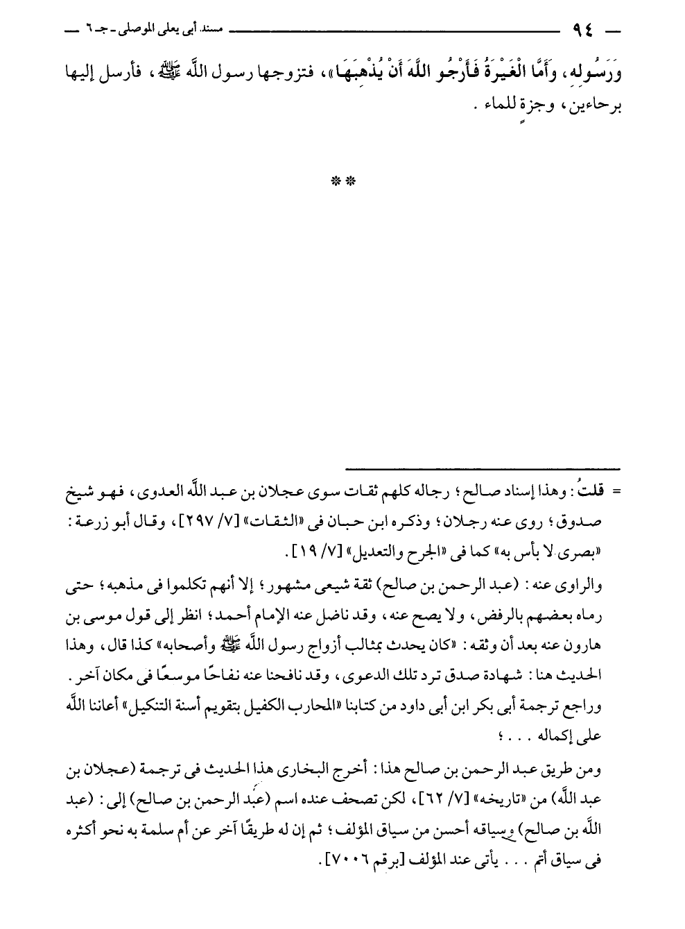 ومن طريق عبد الرحمن بن صالح هذا: أخرج البخاري هذا الحديث في ترجمة (عجلان بن عبد الله) من "تاريخه" [٧/ ٦٢]، لكن تصحف عنده اسم (عبد الرحمن بن صالح) إلى: (عبد الله بن صالح) سياقه أحسن من سياق المؤلف؛ ثم إن له طريقًا آخر عن أم سلمة به نحو أكثره في سياق أتم ... يأتي عند المؤلف [برقم ٧٠٠٦].