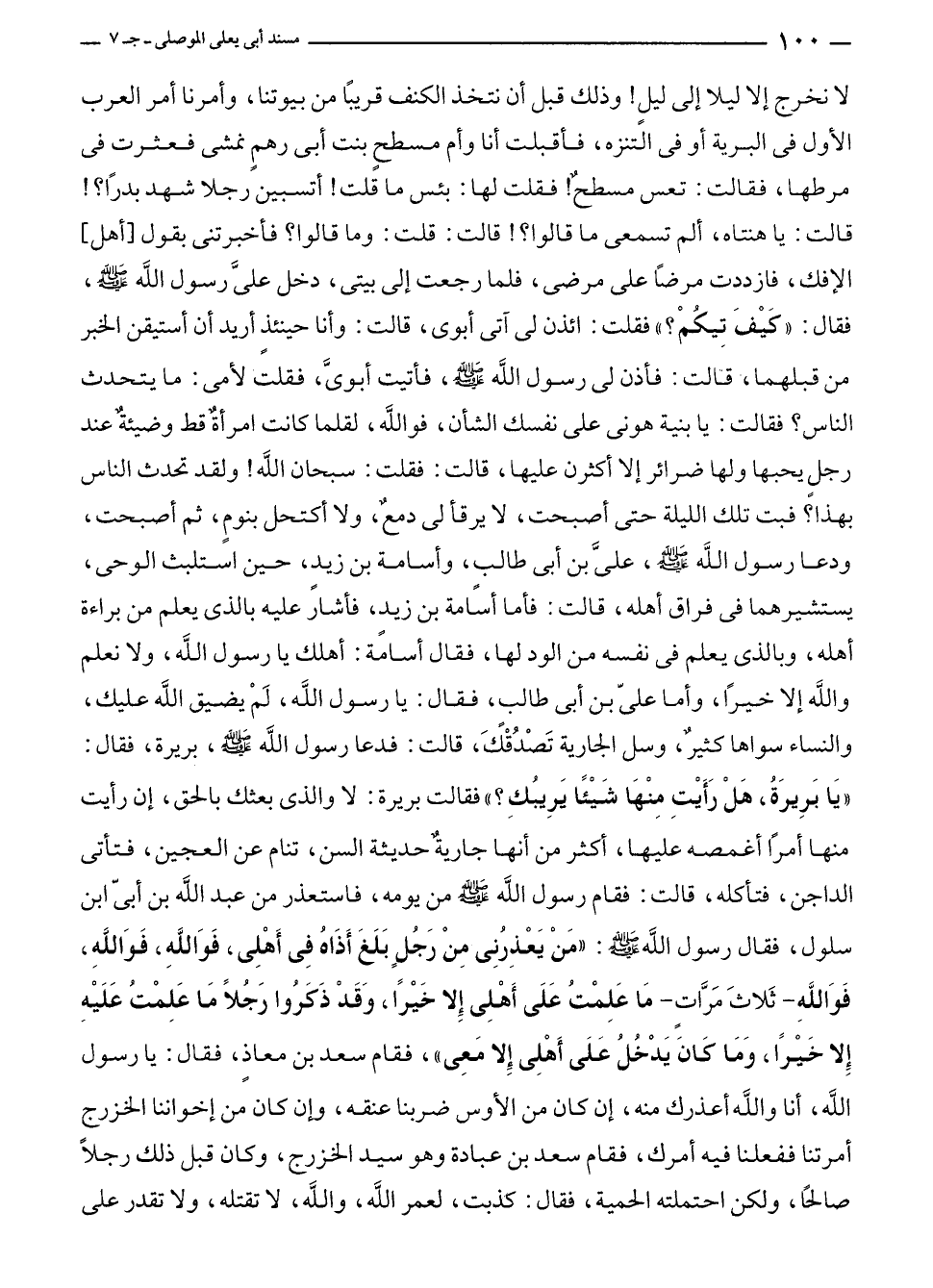 لا نخرج إلا ليلا إلى ليلٍ! وذلك قبل أن نتخذ الكنف قريبًا من بيوتنا، وأمرنا أمر العرب الأول في البرية أو في المتنزه، فأقبلت أنا وأم مسطحٍ بنت أبى رهمٍ نمشى فعثرت في مرطها، فقالت: تعس مسطحٌ! فقلت لها: بئس ما قلت! أتسبين رجلا شهد بدرًا؟! قالت: يا هنتاه، ألم تسمعى ما قالوا؟! قالت: قلت: وما قالوا؟ فأخبرتنى بقول [أهل] الإفك، فازددت مرضًا على مرضى، فلما رجعت إلى بيتى، دخل عليَّ رسول الله - صلى الله عليه وسلم -، فقال: "كيْفَ تِيكُمْ؟ " فقلت: ائذن لى آتى أبوى، قالت: وأنا حينئذٍ أريد أن أستيقن الخبر من قبلهما، قالت: فأذن لى رسول الله - صلى الله عليه وسلم -، فأتيت أبويَّ، فقلت لأمى: ما يتحدث الناس؟ فقالت: يا بنية هونى على نفسك الشأن، فواللَّه، لقلما كانت امرأةٌ قط وضيئةٌ عند رجلٍ يحبها ولها ضرائر إلا أكثرن عليها، قالت: فقلت: سبحان الله! ولقد تحدث الناس بهذا؟ فبت تلك الليلة حتى أصبحت، لا يرقأ لى دمعٌ، ولا أكتحل بنومٍ، ثم أصبحت، ودعا رسول الله - صلى الله عليه وسلم -، عليَّ بن أبى طالب، وأسامة بن زيدٍ، حين استلبث الوحى، يستشيرهما في فراق أهله، قالت: فأما أسامة بن زيد، فأشار عليه بالذى يعلم من براءة أهله، وبالذى يعلم في نفسه من الود لها، فقال أسامة: أهلك يا رسول الله، ولا نعلم والله إلا خيرًا، وأما عليّ بن أبى طالب، فقال: يا رسول الله، لَمْ يضيق الله عليك، والنساء سواها كثيرٌ، وسل الجارية تَصْدُقْك، قالت: فدعا رسول الله - صلى الله عليه وسلم -، بريرة، فقال: "يَا بَرِيرَةُ، هَلْ رَأَيْتِ مِنْهَا شَيْئًا يَرِيبُكِ؟ " فقالت بريرة: لا والذى بعثك بالحق، إن رأيت منها أمرًا أغمصه عليها، أكثر من أنها جارية حديثة السن، تنام عن العجين، فتأتى الداجن، فتأكله، قالت: فقام رسول الله - صلى الله عليه وسلم - من يومه، فاستعذر من عبد الله بن أبيّ ابن سلول، فقال رسول الله - صلى الله عليه وسلم - "مَنْ يَعْذِرُنِى مِنْ رَجُلٍ بَلَغَ أَذَاهُ في أَهْلِى، فَوَاللهِ، فَوَالله، فَوَاللهِ - ثَلاثَ مَرَّاتٍ - مَا عَلِمْتُ عَلَى أَهْلِى إلا خَيْرًا، وَقَدْ ذَكَرُوا رَجُلًا مَا عَلِمْتُ عَلَيْهِ إلا خَيْرًا، وَمَا كَانَ يَدْخُلُ عَلَى أَهْلِى إلا مَعِى"، فقام سعد بن معاذٍ، فقال: يا رسول الله، أنا واللَّه أعذرك منه، إن كان من الأوس ضربنا عنقه، وإن كان من إخواننا الخزرج أمرتنا ففعلنا فيه أمرك، فقام سعد بن عبادة وهو سيد الخزرج، وكان قبل ذلك رجلًا صالحًا، ولكن احتملته الحمية، فقال: كَذبت، لعمر الله، واللَّه، لا تقتله، ولا تقدر على