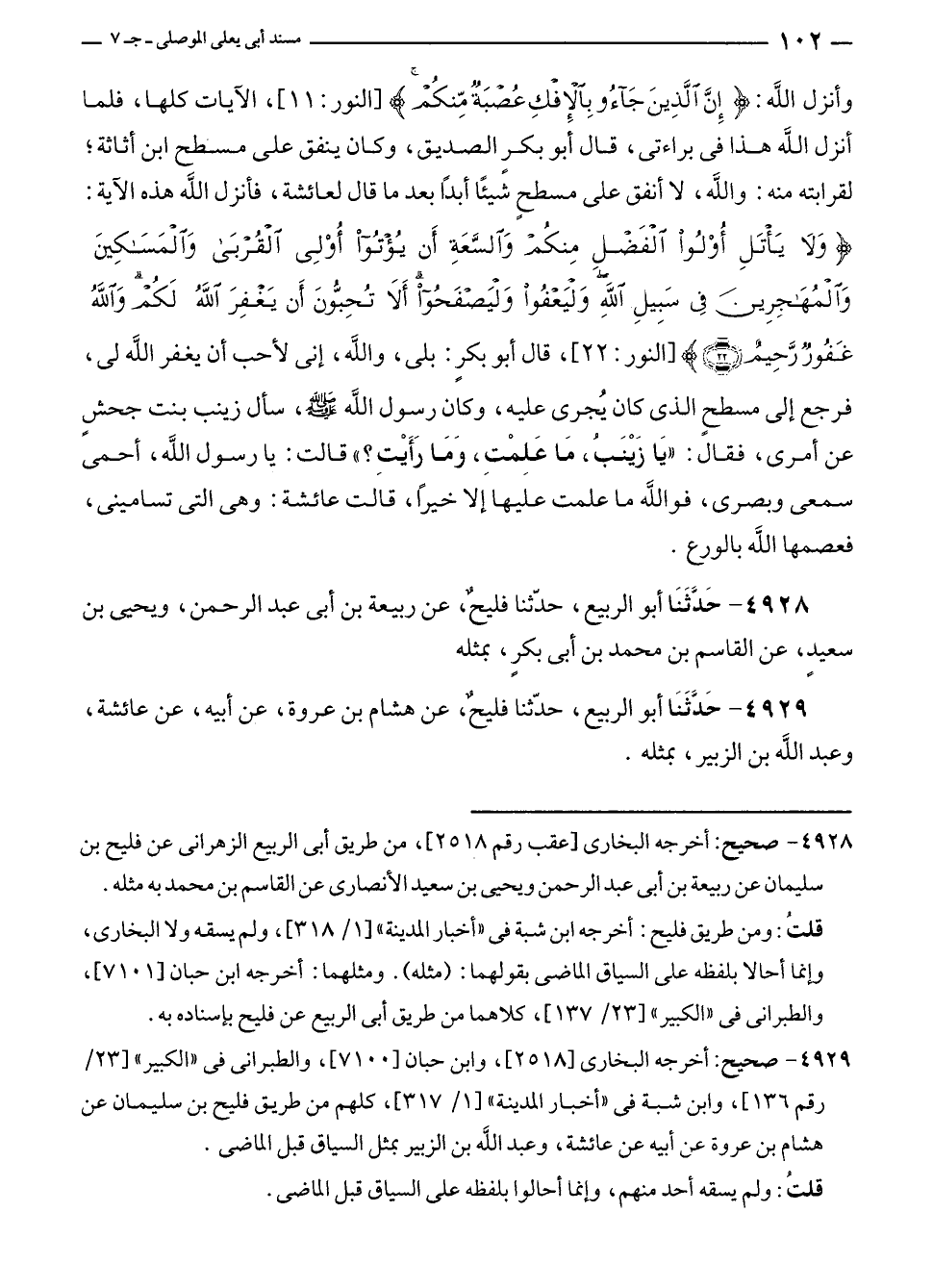 وأنزل الله: {إِنَّ الَّذِينَ جَاءُوا بِالْإِفْكِ عُصْبَةٌ مِنْكُمْ} [النور: ١١]، الآيات كلها، فلما أنزل الله هذا في براءتى، قال أَبو بكر الصديق، وكان ينفق على مسطح ابن أثاثة؛ لقرابته منه: واللَّه، لا أنفق على مسطحٍ شيئًا أبدًا بعد ما قال لعائشة، فأنزل الله هذه الآية: {وَلَا يَأْتَلِ أُولُو الْفَضْلِ مِنْكُمْ وَالسَّعَةِ أَنْ يُؤْتُوا أُولِي الْقُرْبَى وَالْمَسَاكِينَ وَالْمُهَاجِرِينَ فِي سَبِيلِ اللَّهِ وَلْيَعْفُوا وَلْيَصْفَحُوا أَلَا تُحِبُّونَ أَنْ يَغْفِرَ اللَّهُ لَكُمْ وَاللَّهُ غَفُورٌ رَحِيمٌ (٢٢)} [النور: ٢٢]، قال أبو بكرٍ: بلى، والله، إنى لأحب أن يغفر الله لى، فرجع إلى مسطحٍ الذي كان يُجرى عليه، وكان رسول الله - صلى الله عليه وسلم -، سأل زينب بنت جحشٍ عن أمرى، فقال: "يَا زَيْنَبُ، مَا عَلِمْتِ، وَمَا رَأَيْتِ؟ " قالت: يا رسول الله، أحمى سمعى وبصرى، فوالله ما علمت عليها إلا خيرًا، قالت عائشة: وهى التى تسامينى، فعصمها الله بالورع.