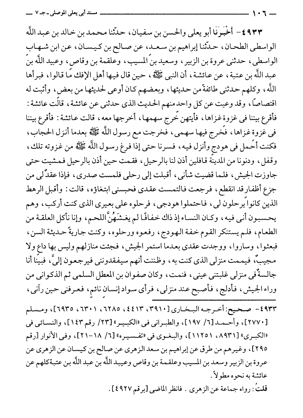 ٤٩٣٣ - أَخْبَرَنَا أبو يعلى والحسن بن سفيان، حدّثنا محمد بن خالد بن عبد الله الواسطى الطحان، حدّثنا إبراهيم بن سعد، عن صالح بن كيسان، عن ابن شهاب الواسطى، حدثنى عروة بن الزبير، وسعيد بن المسيب، وعلقمة بن وقاص، وعبيد الله بن عبد الله بن عتبة، عن عائشة، أن النبي - صلى الله عليه وسلم -، حين قال فيها أهل الإفك ما قالوا، فبرأها الله، وكلهم حدثنى طائفةً من حديثها، وبعضهم كان أوعى لحديثها من بعض، وأثبت له اقتصاصًا، وقد وعيت عن كل واحد منهم الحديث الذي حدثنى عن عائشة، قالت عائشة: فأقرع بيننا في غزوة غزاها، فأيتهن خرج سهمها، أخرجها معه، قالت عائشة: فأقرع بيننا في غزوةٍ غزاها، فخرج فيها سهمى، فخرجت مع رسول الله - صلى الله عليه وسلم - بعدما أنزل الحجاب، فكنت أحمل في هودجٍ وأنزل فيه، فسرنا حتى إذا فرغ رسول الله - صلى الله عليه وسلم - من غزوته تلك، وقفل، ودنونا من المدينة قافلين أذن لنا بالرحيل، فقمت حين أذن بالرحيل فمشيت حتى جاوزت الجيش، فلما قضيت شأنى، أقبلت إلى رحلى فلمست صدرى، فإذا عقدٌ لى من جزع أظفار قد انقطع، فرجعت فالتمست عقدى فحبسنى ابتغاؤه، قالت: وأقبل الرهط الذين كانوا يرحلون لى، فاحتملوا هودجى، فرحلوه على بعيرى الذي كنت أركب، وهم يحسبون أنى فيه، وكان النساء إذ ذاك خفافًا لم يغشَهُنَّ اللحم، وإنا نأكل العلقة من الطعام، فلم يستنكر القوم خفة الهودج، رفعوه ورحلوه، وكلنت جاريةً حديثة السن، فبعثوا، وساروا، ووجدت عقدى بعدما استمر الجيش، فجئت منازلهم وليس بها داعٍ ولا مجيبٌ، فيممت منزلى الذي كنت به، وظننت أنهم سيفقدوننى فيرجعون إليَّ، فبينا أنا جالسةٌ في منزلى غلبتنى عينى، فنمت، وكان صفوان بن المعطل السلمى ثم الذكوانى من وراء الجيش، فأدلج، فأصبح عند منزلى، فرأى سواد إنسانٍ نائمٍ، فعرفنى حين رآنى،