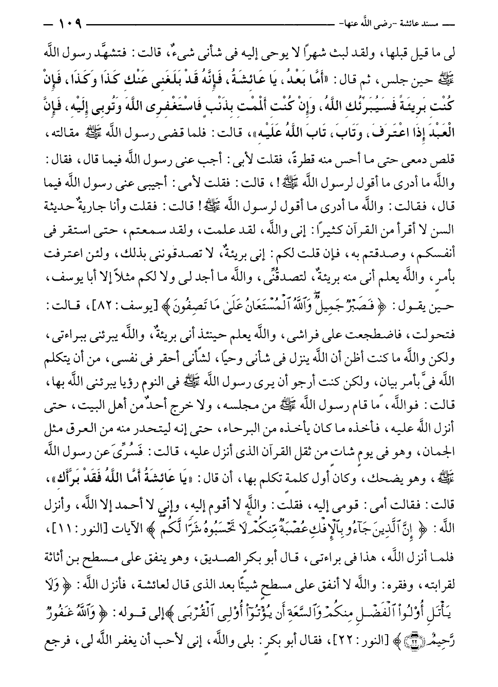 لى ما قيل قبلها، ولقد لبث شهرًا لا يوحى إليه في شأنى شئٌ، قالت: فتشهَّد رسول الله - صلى الله عليه وسلم - حين جلس، ثم قال: "أَمَّا بَعْدُ، يَا عَائِشَةُ، فَإنهُ قَدْ بَلَغَنِى عَنْكِ كَذَا وَكَذَا، فَإن كُنْتِ بَرِيئَةً فَسَيُبَرِّئكِ الله، وَإن كُنْتِ أَلمْمْتِ بِذَنْبٍ فَاسْتَغْفِرِى اللَّهَ وَتُوبِى إلَيْهِ، فَإنَّ الْعَبْدَ إذَا اعْتَرفَ، وَتَابَ، تَابَ اللَّهُ عَليه"، قالت: فلما قضى رسول الله - صلى الله عليه وسلم - مقالته، قلص دمعى حتى ما أحس منه قطرةً، فقلت لأبى: أجب عنى رسول الله فيما قال، فقال: واللَّه ما أدرى ما أقول لرسول الله - صلى الله عليه وسلم -!، قالت: فقلت لأمى: أجيبى عنى رسول الله فيما قال، فقالت: واللَّه ما أدرى ما أقول لرسول الله - صلى الله عليه وسلم -! قالت: فقلت وأنا جاريةٌ حديثة السن لا أقرأ من القرآن كثيرًا: إنى والله، لقد علمت، ولقد سمعتم، حتى استقر في أنفسكم، وصدقتم به، فإن قلت لكم: إنى بريئةٌ، لا تصدقوننى بذلك، ولئن اعترفت بأمرٍ، واللَّه يعلم أنى منه بريئةٌ، لتصدقُنِّى، والله ما أجد لى ولا لكم مثلًا إلا أبا يوسف، حين يقول: {فَصَبْرٌ جَمِيلٌ وَاللَّهُ الْمُسْتَعَانُ عَلَى مَا تَصِفُونَ} [يوسف: ٨٢]، قالت: فتحولت، فاضطجعت على فراشى، والله يعلم حينئذ أنى بريئة، واللَّه يبرئنى ببراءتى، ولكن والله ما كنت أظن أن الله ينزل في شأنى وحيًا، لشأنى أحقر في نفسى، من أن يتكلم الله فيَّ بأمر بيان، ولكن كنت أرجو أن يرى رسول الله - صلى الله عليه وسلم - في النوم رؤيا يبرئنى الله بها، قالت: فواللَّه، ما قام رسول الله - صلى الله عليه وسلم - من مجلسه، ولا خرج أحدٌ من أهل البيت، حتى أنزل الله عليه، فأخذه ما كان يأخذه من البرحاء، حتى إنه ليتحدر منه من العرق مثل الجمان، وهو في يومٍ شاتٍ من ثقل القرآن الذي أنزل عليه، قالت: فَسُرِّىَ عن رسول الله - صلى الله عليه وسلم -، وهو يضحك، وكان أول كلمة تكلم بها، أن قال: "يَا عَائِشَةُ أَمَّا اللَّهُ فَقَدْ بَرَّأَكِ"، قالت: فقالت أمى: قومى إليه، فقلت: واللَّه لا أقوم إليه، وإنى لا أحمد إلا الله، وأنزل الله: {إِنَّ الَّذِينَ جَاءُوا بِالْإِفْكِ عُصْبَةٌ مِنْكُمْ لَا تَحْسَبُوهُ شَرًّا لَكُمْ} الآيات [النور: ١١]، فلما أنزل الله، هذا في براءتى، قال أبو بكرٍ الصديق، وهو ينفق على مسطح بن أثاثة لقرابته، وفقره: واللَّه لا أنفق على مسطحٍ شيئًا بعد الذي قال لعائشة، فأنزل الله: {وَلَا يَأْتَلِ أُولُو الْفَضْلِ مِنْكُمْ وَالسَّعَةِ أَنْ يُؤْتُوا أُولِي الْقُرْبَى} إلى قوله: {وَاللَّهُ غَفُورٌ رَحِيمٌ (٢٢)} [النور: ٢٢]، فقال أبو بكرٍ: بلى واللَّه، إنى لأحب أن يغفر الله لى، فرجع