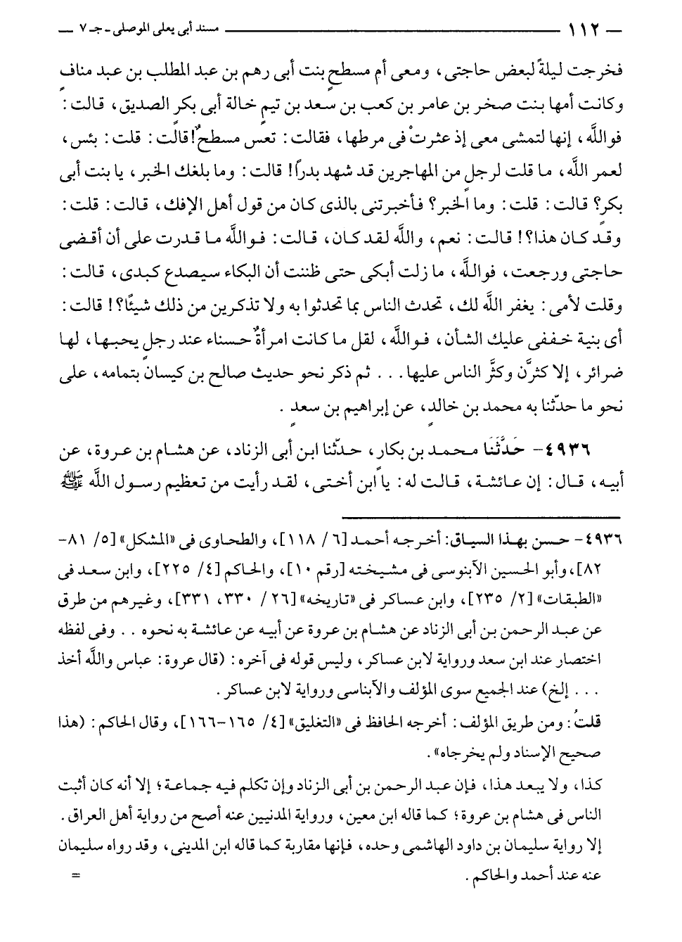 فخرجت ليلةً لبعض حاجتى، ومعى أم مسطحٍ بنت أبى رهم بن عبد المطلب بن عبد منافٍ وكانت أمها بنت صخر بن عامر بن كعب بن سعد بن تيمٍ خالة أبى بكر الصديق، قالت: فواللَّه، إنها لتمشى معى إذ عثرتْ في مرطها، فقالت: تعس مسطحٌ! قالت: قلت: بئس، لعمر الله، ما قلت لرجلٍ من المهاجرين قد شهد بدرًا! قالت: وما بلغك الخبر، يا بنت أبى بكرٍ؟ قالت: قلت: وما الخبر؟ فأخبرتنى بالذى كان من قول أهل الإفك، قالت: قلت: وقد كان هذا؟! قالت: نعم، واللَّه لقد كان، قالت: فواللَّه ما قدرت على أن أقضى حاجتى ورجعت، فواللَّه، ما زلت أبكى حتى ظننت أن البكاء سيصدع كبدى، قالت: وقلت لأمى: يغفر الله لك، تحدث الناس بما تحدثوا به ولا تذكرين من ذلك شيئًا؟! قالت: أبى بنية خففى عليك الشأن، فواللَّه، لقل ما كانت امرأة حسناء عند رجلٍ يحبها، لها ضرائر، إلا كثرَّن وكثَّر الناس عليها ... ثم ذكر نحو حديث صالح بن كيسان بتمامه، على نحو ما حدّثنا به محمد بن خالدٍ، عن إبراهيم بن سعد.