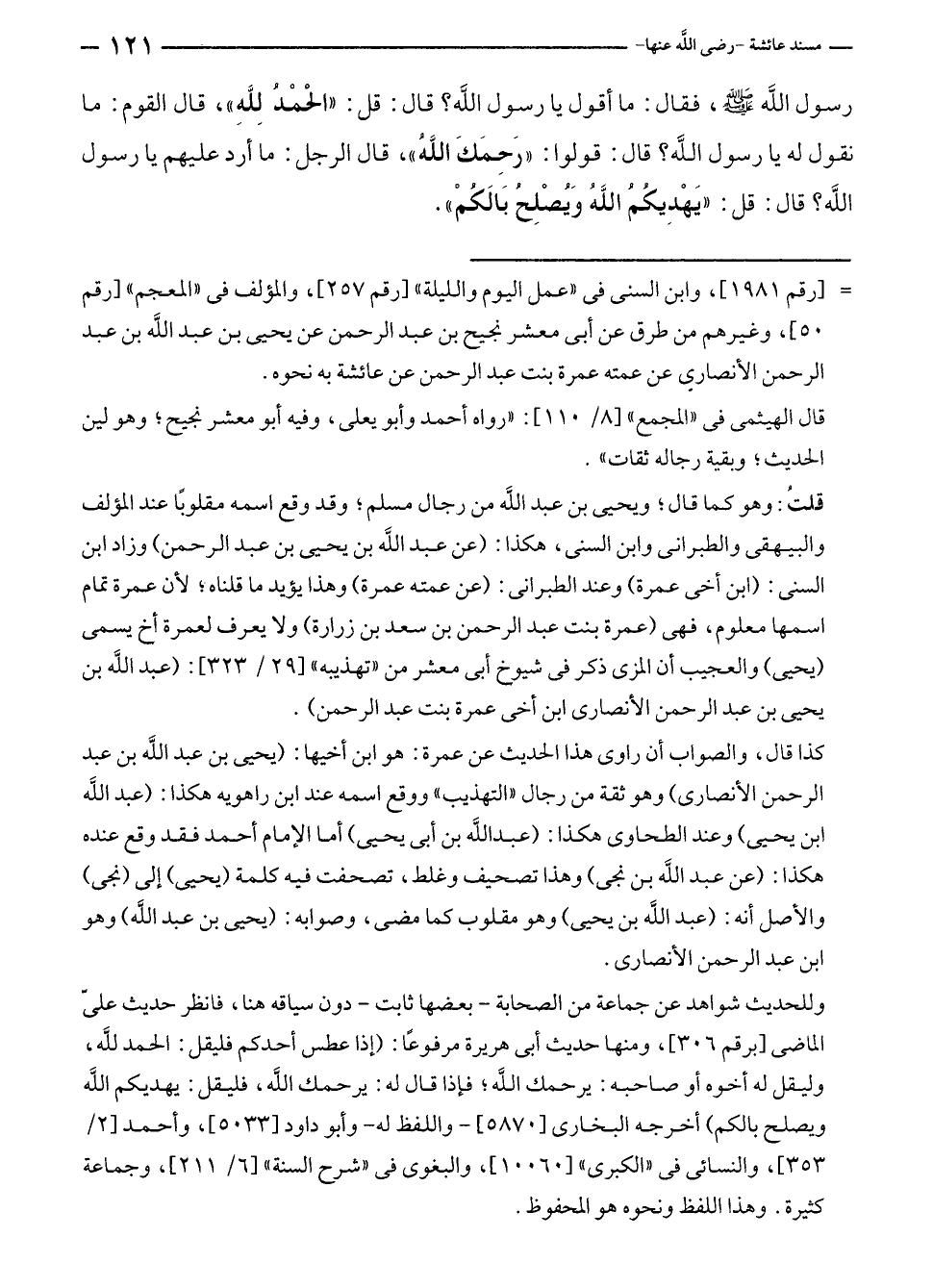 قلتُ: وهو كما قال؛ ويحيى بن عبد الله من رجال مسلم؛ وقد وقع اسمه مقلوبًا عند المؤلف والبيهقى والطبرانى وابن السنى، هكذا: (عن عبد الله بن يحيى بن عبد الرحمن) وزاد ابن السنى: (ابن أخى عمرة) وعند الطبراني: (عن عمته عمرة) وهذا يزيد ما قلناه؛ لأن عمرة تمام اسمها معلوم، فهى (عمرة بنت عبد الرحمن بن سعد بن زرارة) ولا يعرف لعمرة أخ يسمى (يحيى) والعجيب أن المزى ذكر في شيوخ أبى معشر من "تهذيبه" [٢٩/ ٣٢٣]: (عبد الله بن يحيى بن عبد الرحمن الأنصارى ابن أخى عمرة بنت عبد الرحمن).