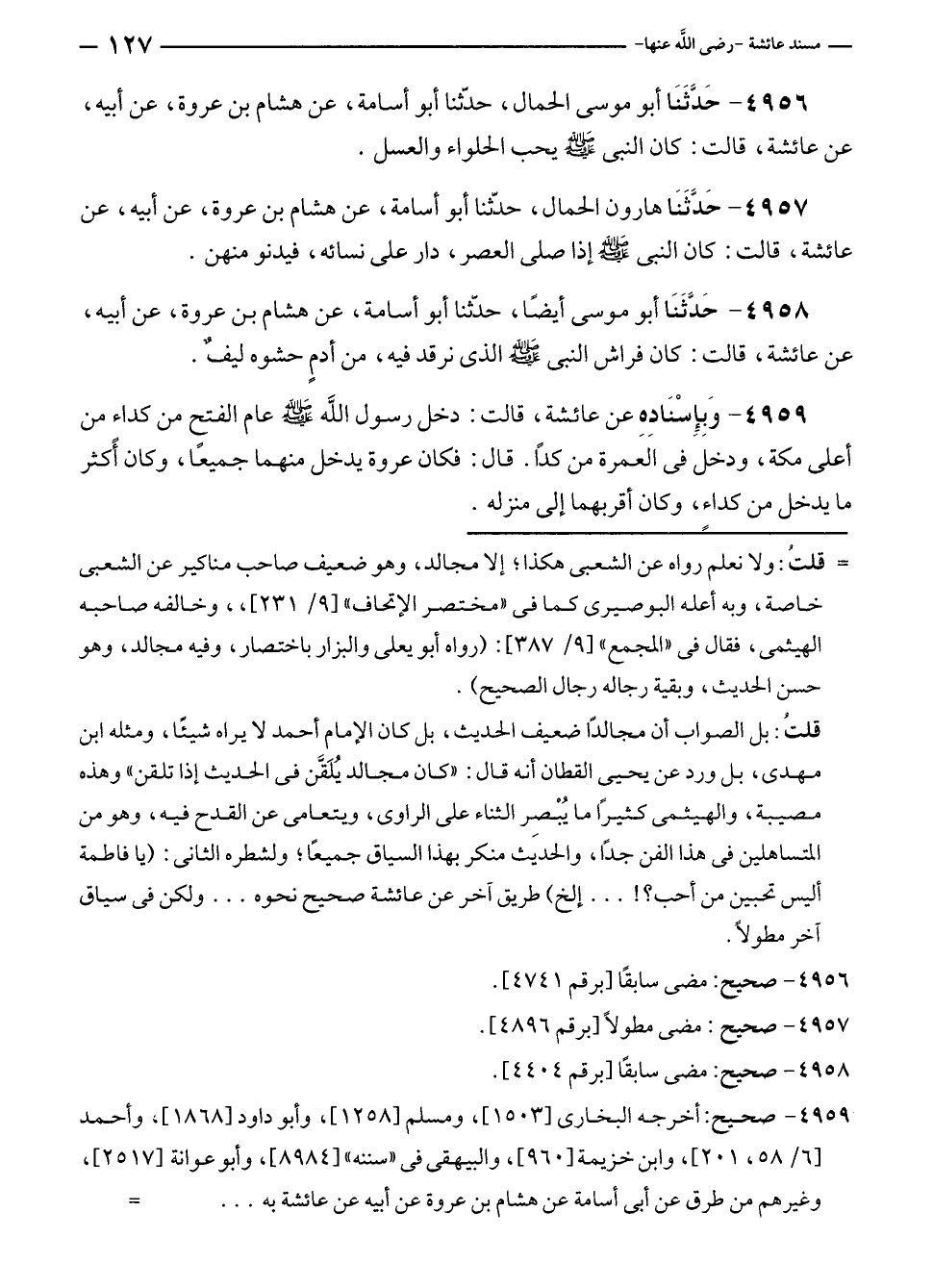 ٤٩٥٧ - حَدَّثَنَا هارون الحمال، حدّثنا أبو أسامة، عن هشام بن عروة، عن أبيه، عن عائشة، قالت: كان النبي - صلى الله عليه وسلم - إذا صلى العصر، دار على نسائه، فيدنو منهن.