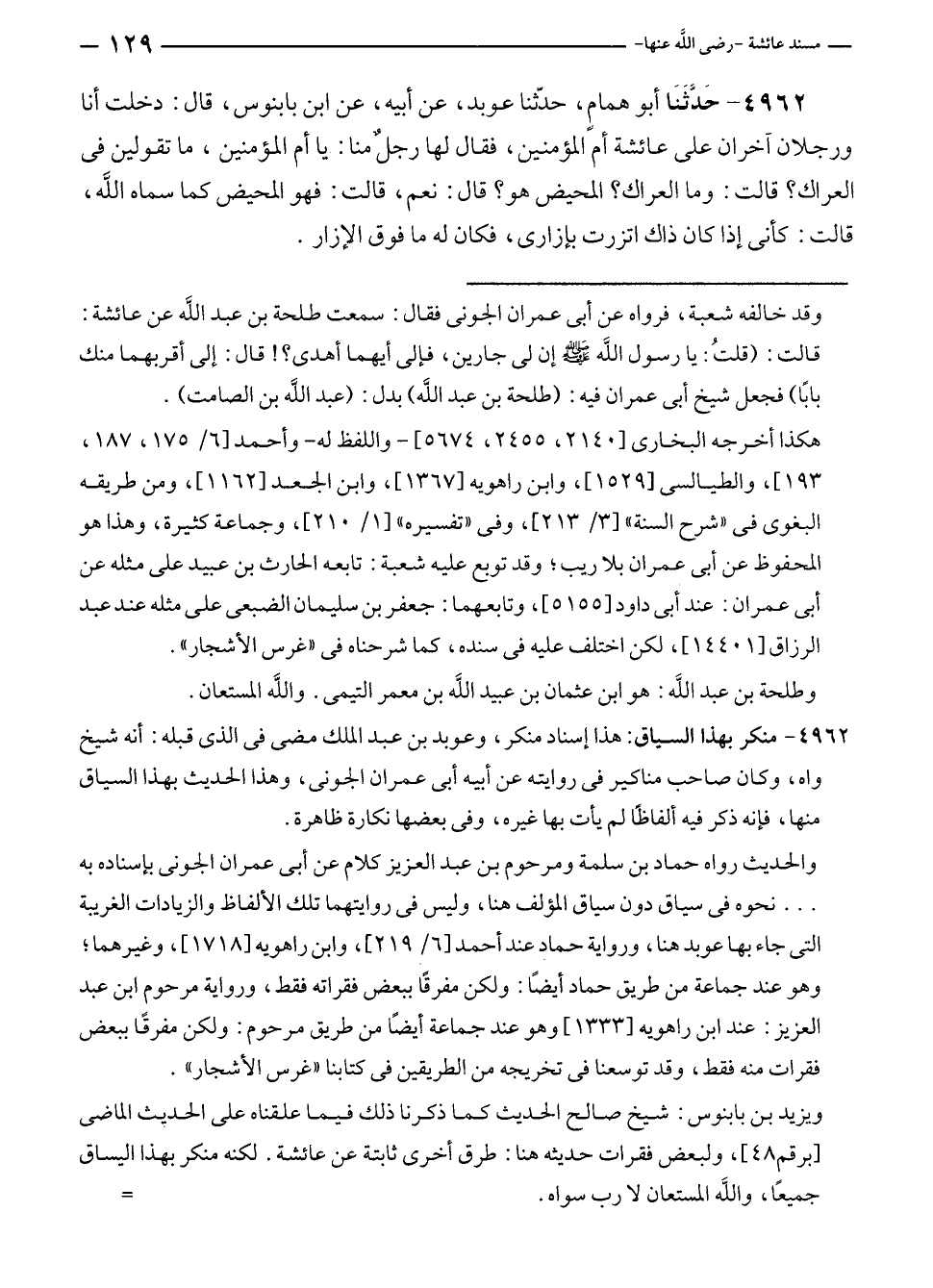 ٤٩٦٢ - حَدَّثَنَا أبو هشام، حدّثنا عوبد، عن أبيه، عن ابن بابنوس، قال: دخلت أنا ورجلان آخران على عائشة أم المؤمنين، فقال لها رجلٌ منا: يا أم المؤمنين، ما تقولين في العراك؟ قالت: وما العراك؟ المحيض هو؟ قال: نعم، قالت: فهو المحيض كما سماه الله، قالت: كأنى إذا كان ذاك اتزرت بإزارى، فكان له ما فوق الإزار.